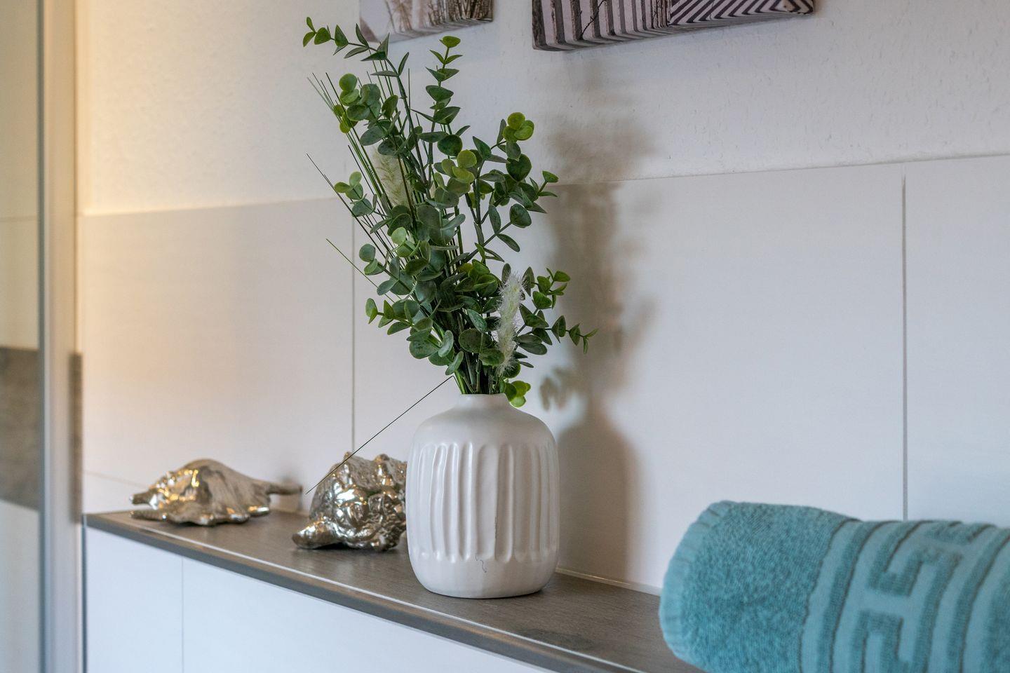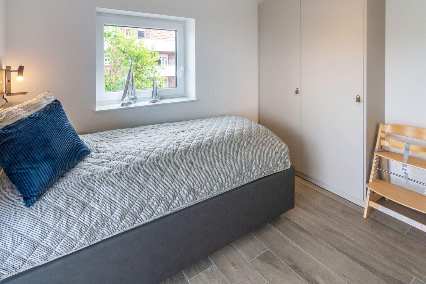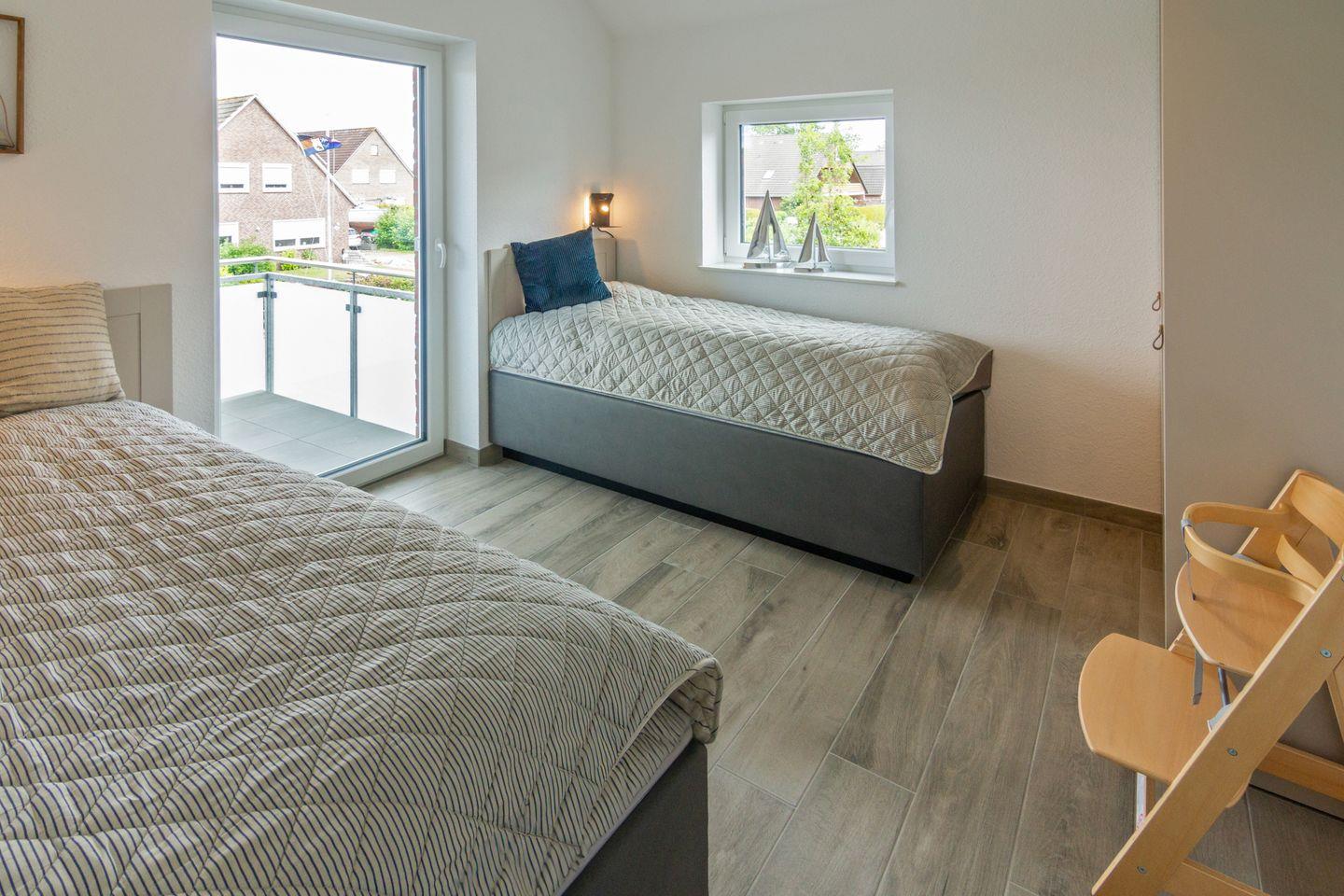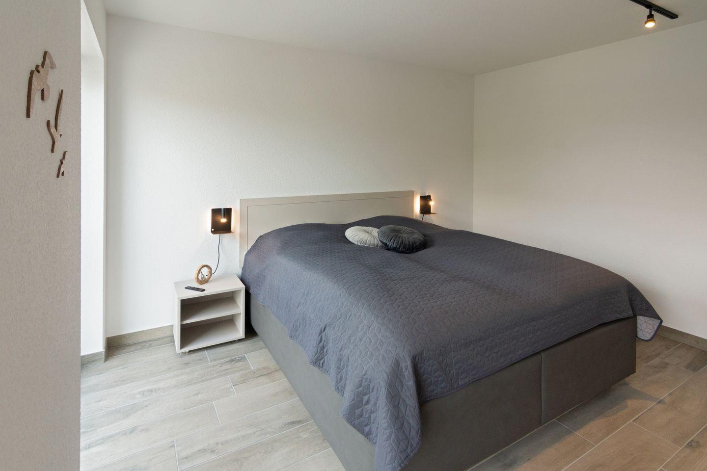 Zwei komfortable Schlafzimmer sorgen für erholsamen Schlaf. Für kleine Gäste stehen Babybett und Hochstuhl bereit. Das moderne Bad bietet eine bodengleiche Dusche, WC, Waschbecken und Föhn. Auch Waschmaschine und Trockner sind vorhanden.