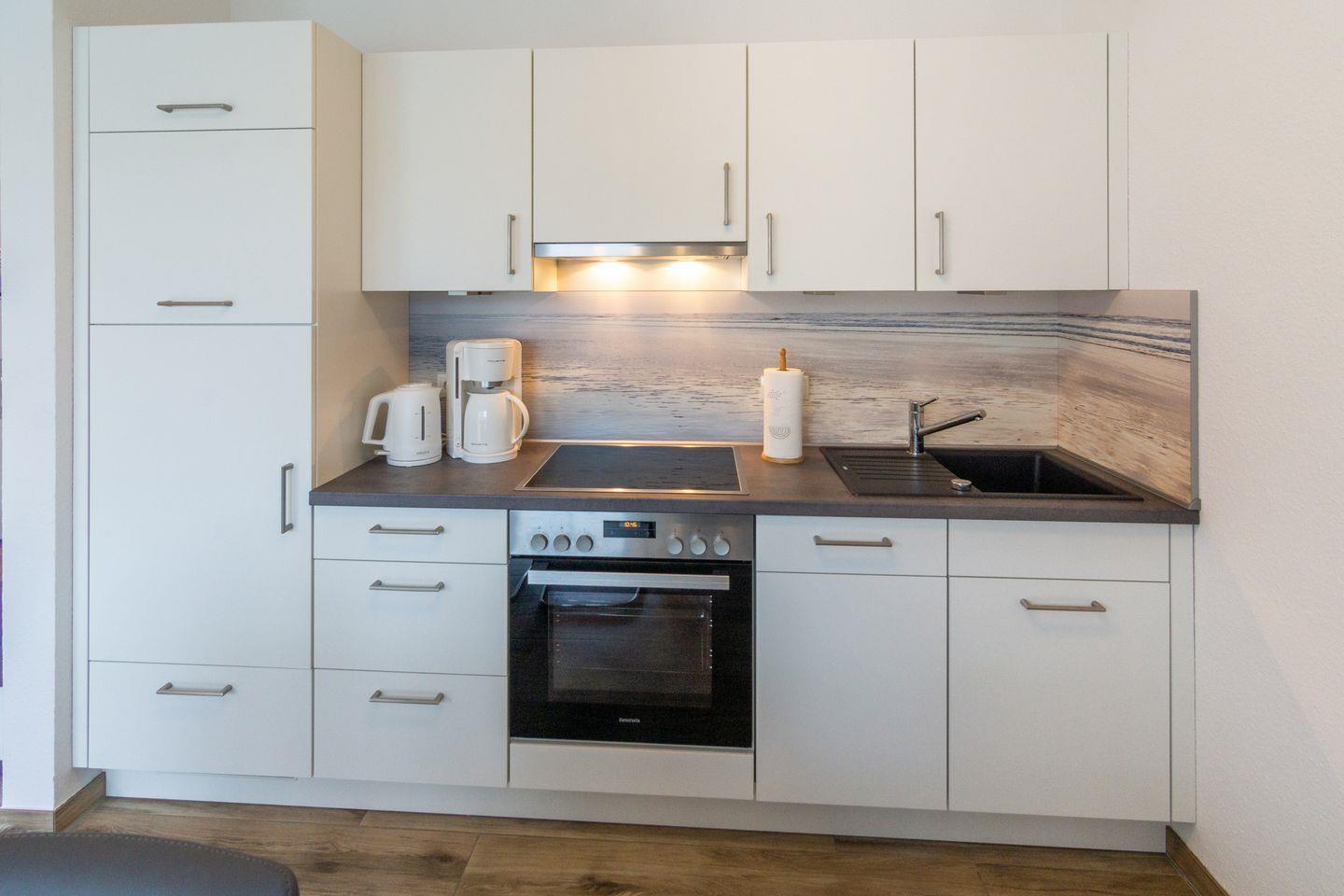 Die stilvolle Wohnung besticht durch ihr offenes Wohnkonzept: Der Wohnbereich mit gemütlichem Sofa und Satelliten-TV geht direkt in die voll ausgestattete Küche über – mit Ceran-Kochfeld, Backofen, Spülmaschine und Kühl-Gefrier-Kombi. Der Essbereich lädt zu gemeinsamen Mahlzeiten ein.