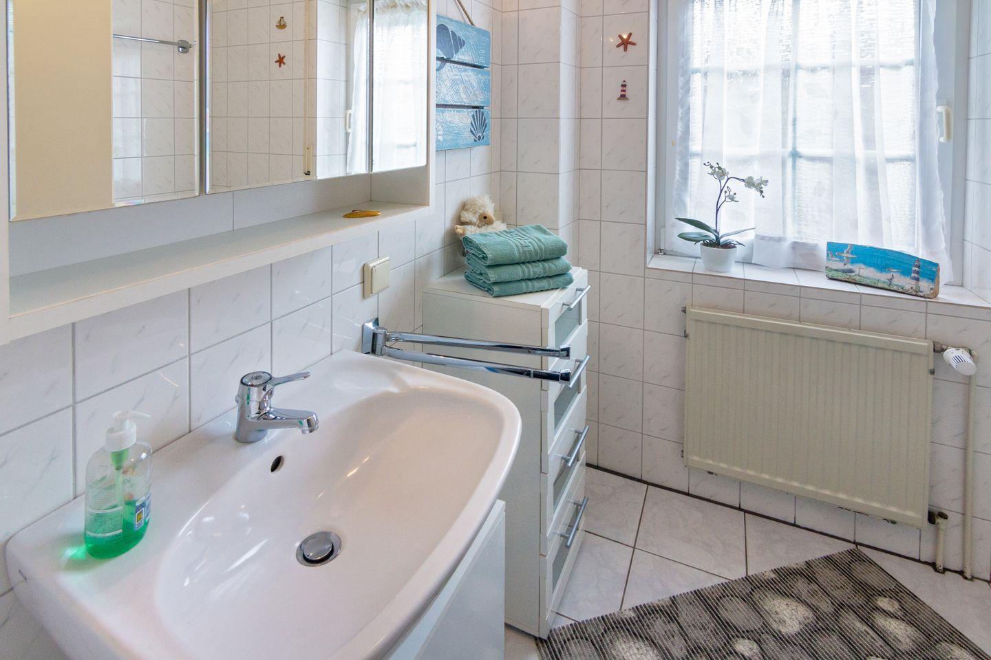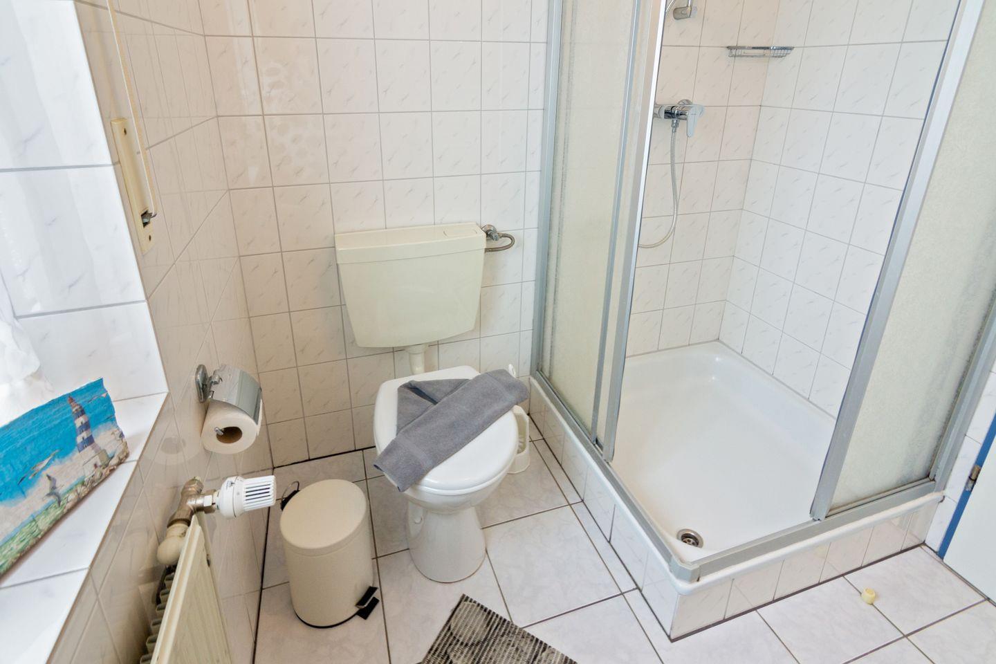 Das Badezimmer verfügt über Dusche, WC, Waschbecken und Föhn – funktional und gepflegt. Ein Highlight ist die möblierte Terrasse mit Sonnenliegen und Elektrogrill – perfekt für entspannte Stunden an der frischen Nordseeluft.
