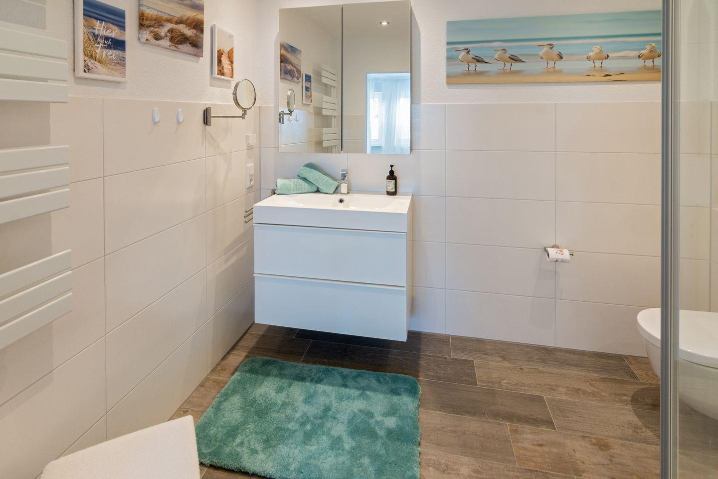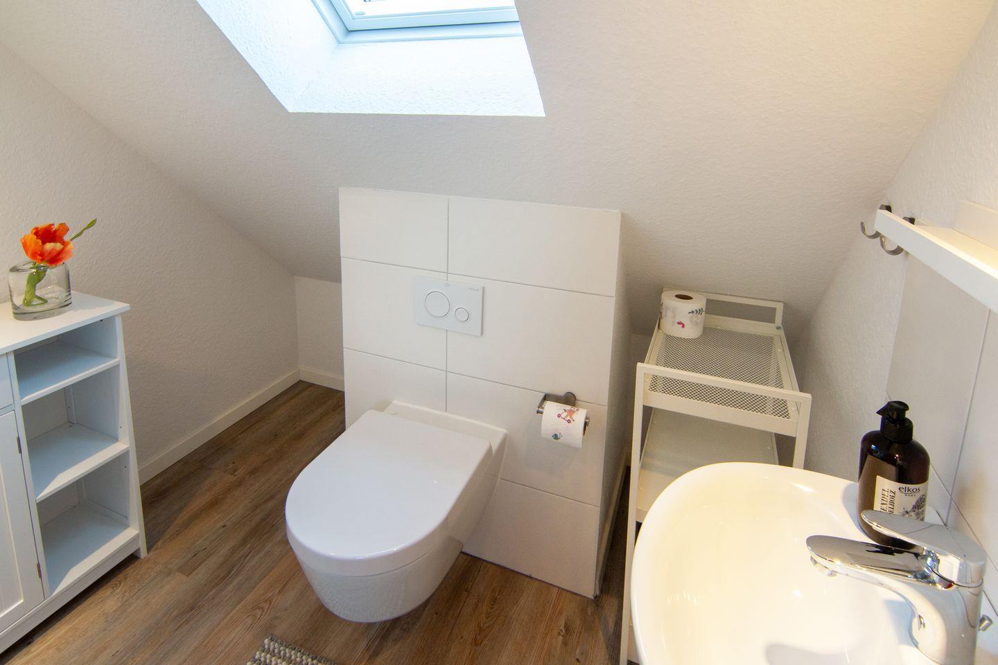 Die 67?m² große, helle Oberwohnung erstreckt sich über zwei Etagen und bietet Platz für bis zu 3 Erwachsene. Sie verfügt über ein geschmackvoll eingerichtetes Schlafzimmer mit modernem Bad en Suite mit bodengleicher Dusche und ein weiteres Schlafzimmer im ausgebauten Dachgeschoss mit Schlafsofa mit einem weiteren kleinen Duschbad en Suite im ausgebauten Dachgeschoss. Alle Zimmer sind mit elektrischen Rollläden ausgestattet. Die gesamte Wohnung ist rauchfrei.