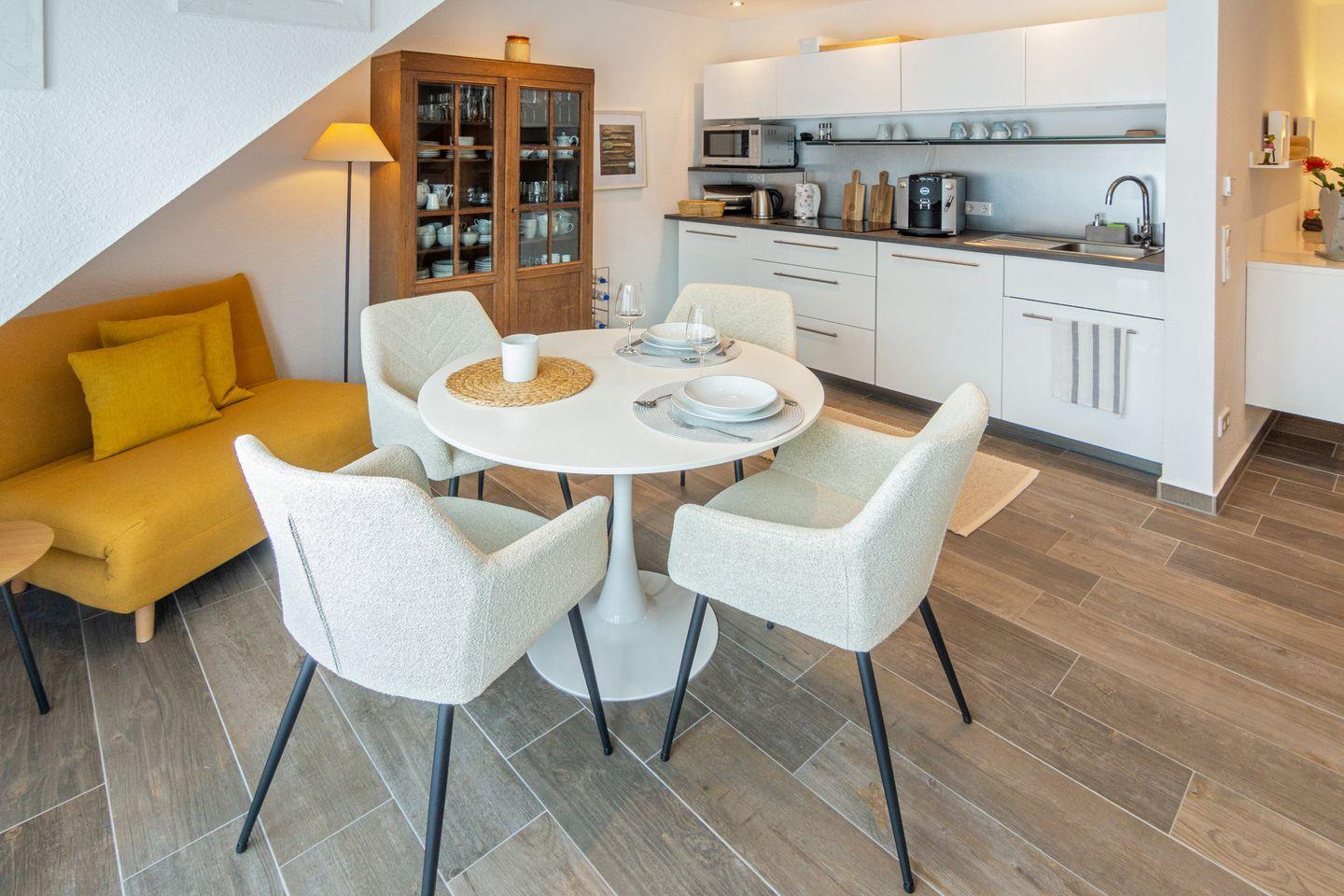 Die stilvoll eingerichtete Oberwohnung "Glückszeit" bietet Platz für bis zu 3 Personen. Sie verfügt über einen offenen Wohn- und Essbereich mit voll ausgestatteter Küche, ein gemütliches Schlafzimmer und ein modernes Bad. Im ausgebauten Dachgeschoss befindet sich über eine gut begehbare Treppe ein weiteres Zimmer mit hochwertigem Schlafsofa sowie ein Bad en Suite. Der sonnige Balkon lädt zum Entspannen ein. Ein PKW-Stellplatz sowie ein Abstellraum für Fahrräder stehen ebenfalls zur Verfügung.