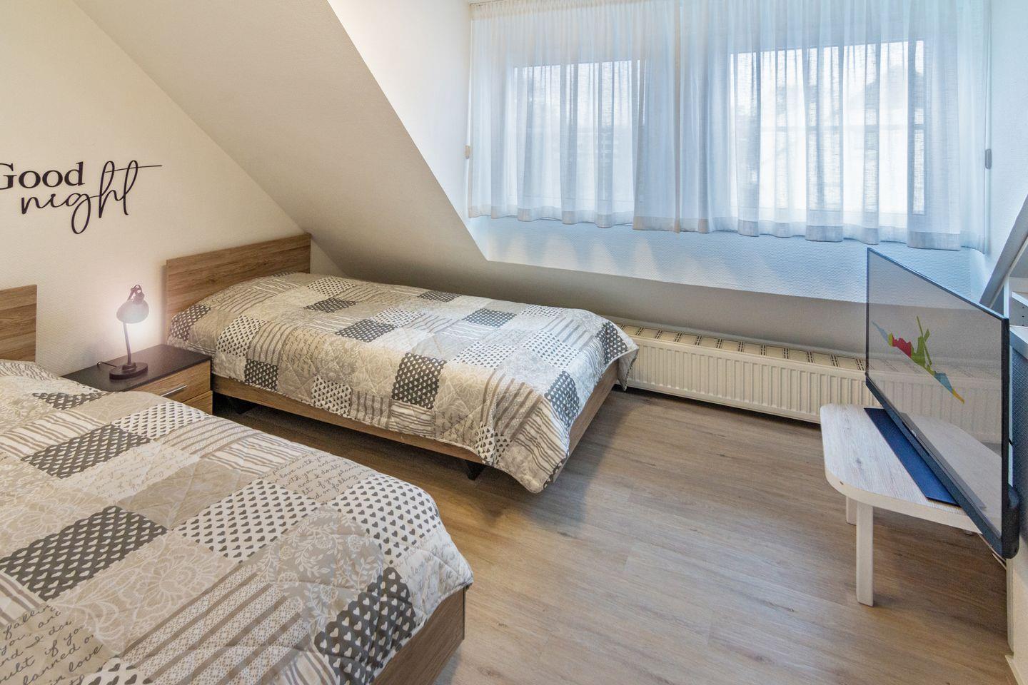 Im Obergeschoss befinden sich zwei separate Schlafzimmer mit Vinylboden und vier Schlafmöglichkeiten. Ein Schlafzimmer verfügt zusätzlich über einen Smart-TV. Ein modernes Duschbad mit WC und Fenster sowie ein Gäste-WC vervollständigen die Ausstattung.