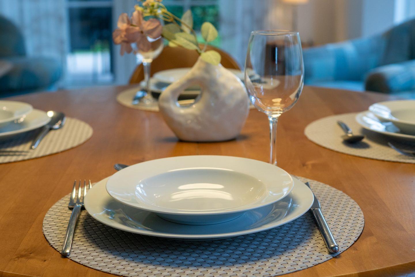 Im Erdgeschoss erwarten Sie ein gemütlicher Wohnbereich mit Sofalandschaft, Smart-TV, Zugang zur Terrasse und Garten sowie ein Essbereich. Die geschlossene Küche ist hochwertig ausgestattet – mit Ceranfeld, Backofen, Spülmaschine, Mikrowelle, Kühlschrank mit Gefrierfach, Kaffeemaschine, Toaster, Wasserkocher, Mixer und umfangreichem Kücheninventar. Waschmaschine, Wäscheständer, Bügelbrett und ein Elektrogrill sind ebenfalls vorhanden.