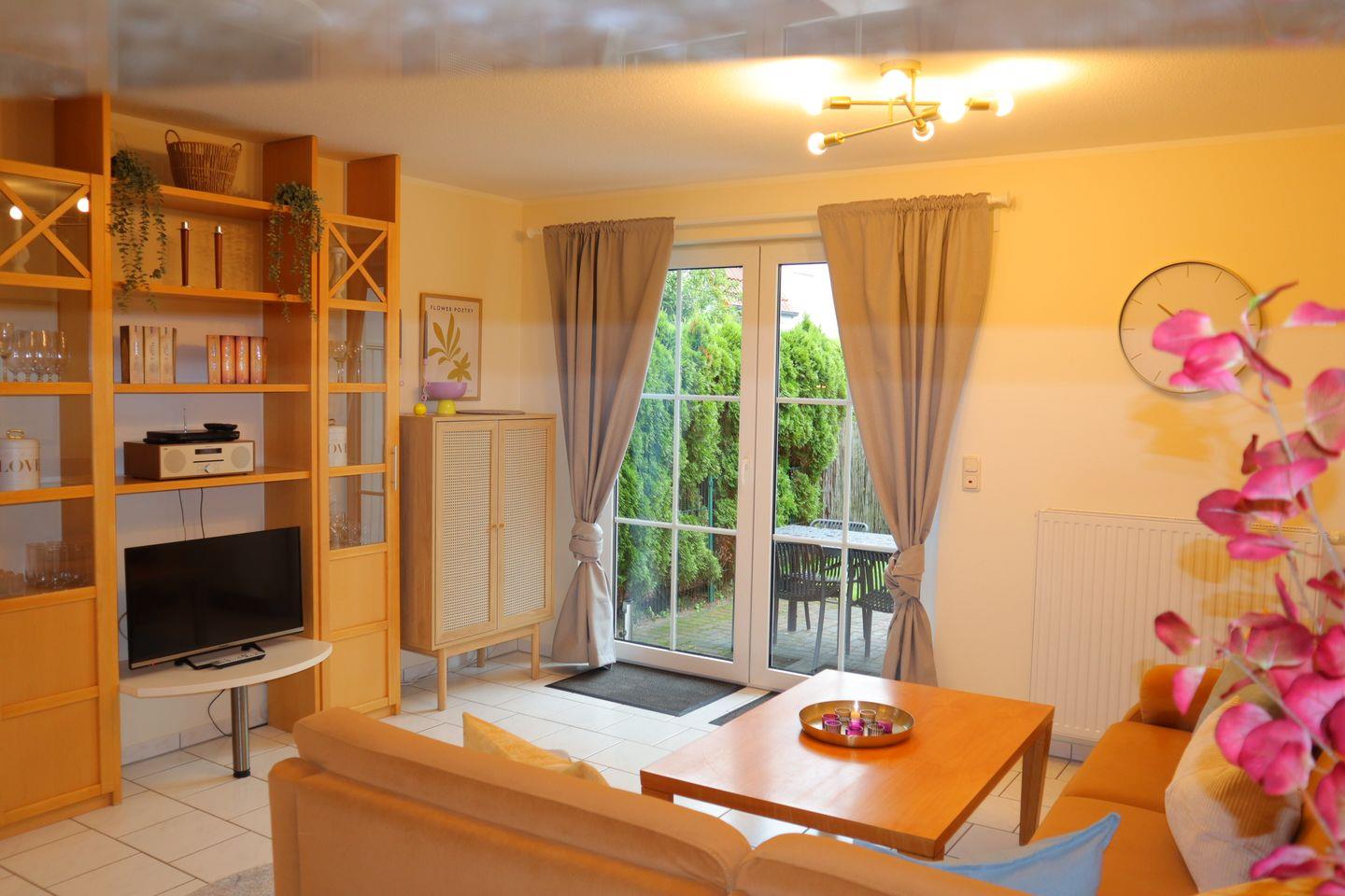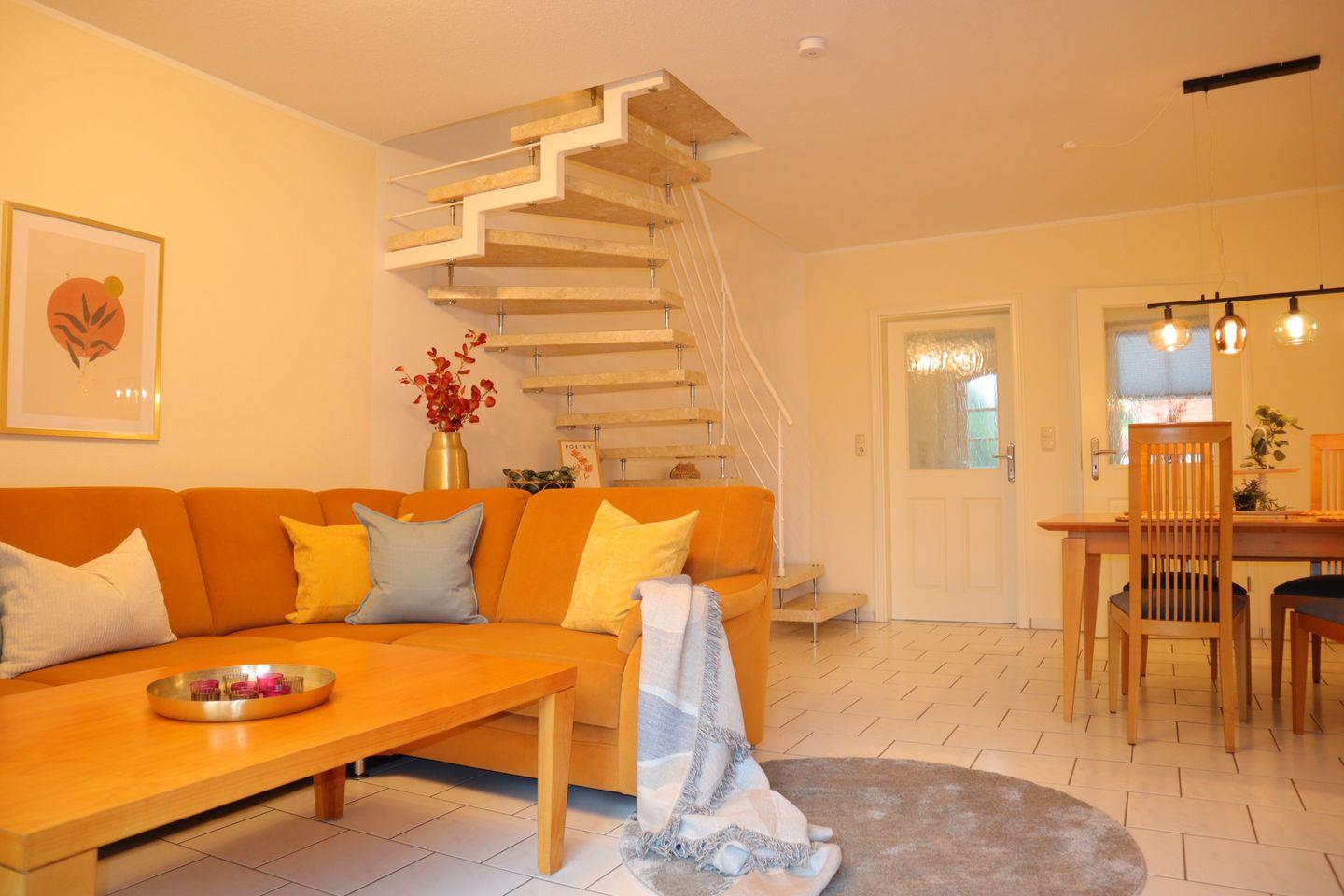 Das liebevoll eingerichtete Reihenmittelhaus bietet auf 70 m² alles, was Sie für einen erholsamen Urlaub brauchen. Zwei separate Schlafzimmer sorgen für Privatsphäre und einen erholsamen Schlaf. Der helle und großzügige Wohnbereich mit gemütlicher Sofaecke, moderner Fußbodenheizung und offener Einbauküche ist der perfekte Treffpunkt für gemeinsame Stunden. Die Küche ist mit allem ausgestattet, was das Herz begehrt – vom Ceranherd bis zum Gefrierschrank – und lädt zu genussvollen Kochmomenten ein.