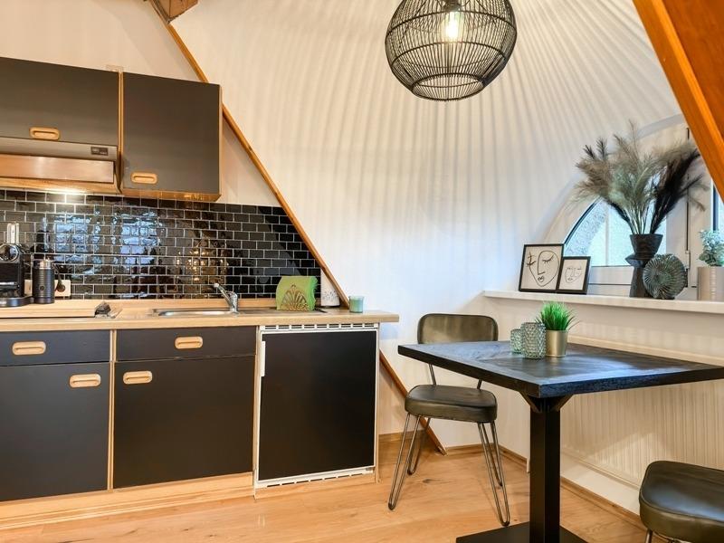 Die Küchenzeile ist komplett ausgestattet. Von der Nespresso Kaffeekapselmaschine über Mikrowelle, Kühlschrank und Kochplatten bis zum Toaster ist alles vorhanden.