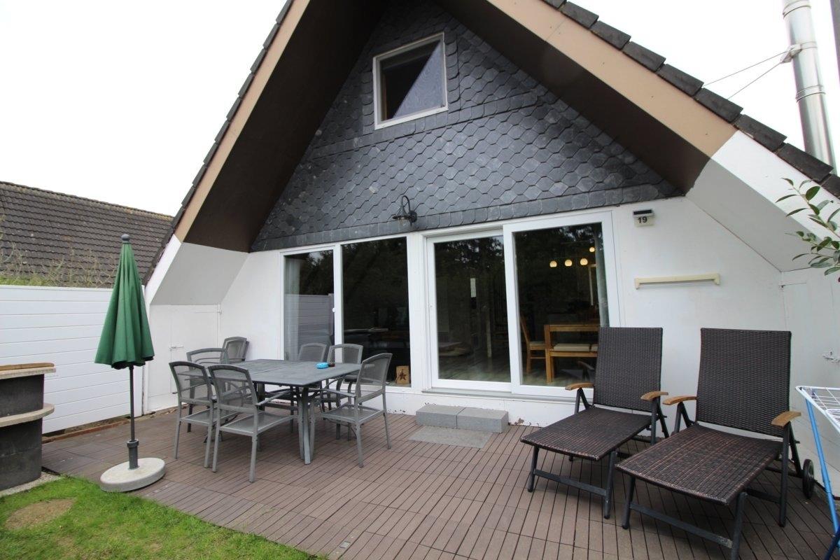 Auf der Terrasse befinden sich 2 Sonnenliegen und Gartenmöbel für 6 Personen sowie ein gemauerter Grill.