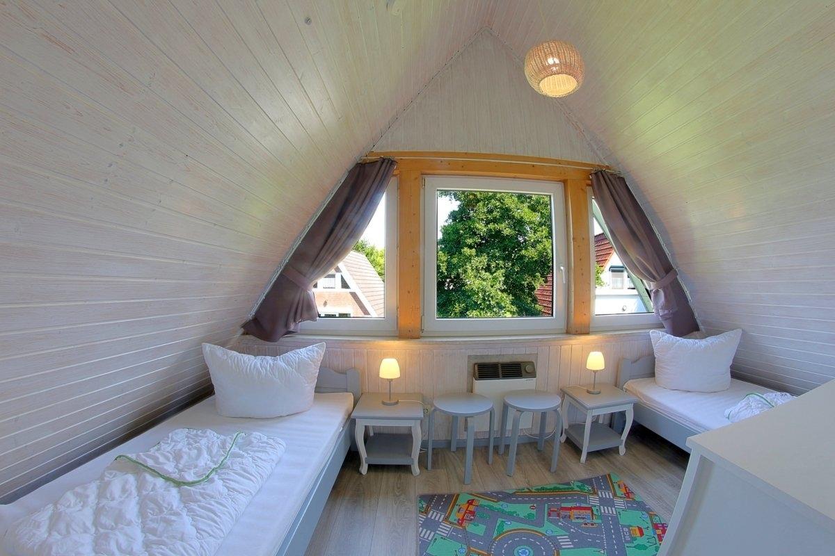 Im Obergeschoss befinden sich die beiden Schlafräume. Das "Elternschlafzimmer" hat ein Doppelbett, Kleiderschrank und Flachbild-TV. Das "Kinderschlafzimmer" hat zwei getrennt stehenden Betten. Für kleinere Kinder kann das vorhandene Zustellbett aufgestellt werden.