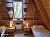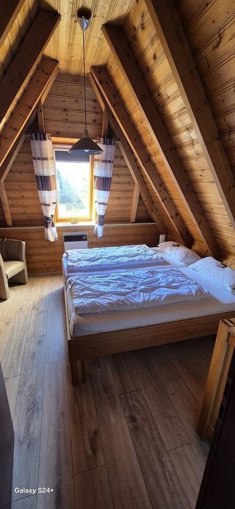 Im Obergeschoss befindet sich ein Schlafzimmer mit Doppelbett, feststehendem Kinderbett, Herrendiener, Spiegel und TV Gerät.