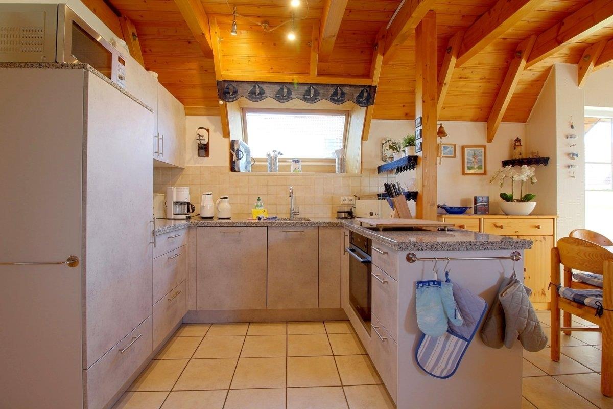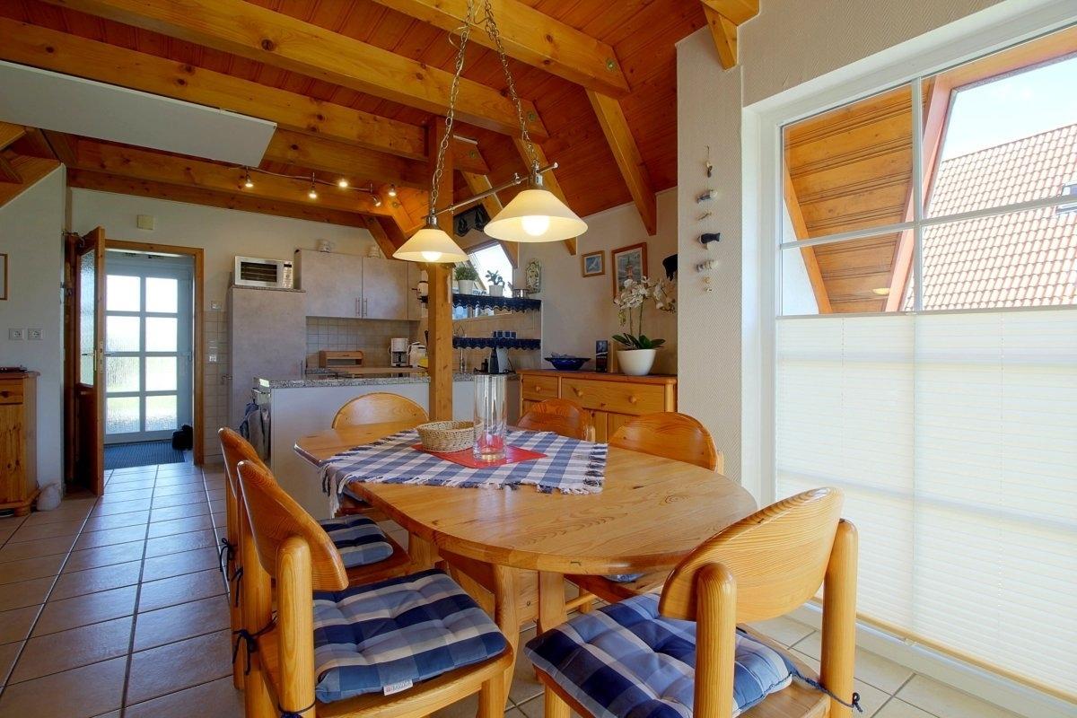 Im familienfreundlich gestalteten, im Erdgeschoss komplett gefliesten Haus, gibt es ein offenes Wohn-/Esszimmer, welches standardmäßig mit Fernseher inkl. Kabel- und Skyanschluss ausgestattet ist., Der Kaminofen für die kältere Jahreszeit bietet besondere Wohlfühlatmosphäre. Einbauküche mit Geschirrspüler und Mikrowelle. Vom Wohnraum aus geht es direkt auf die Terrasse mit Gartenmöbeln.