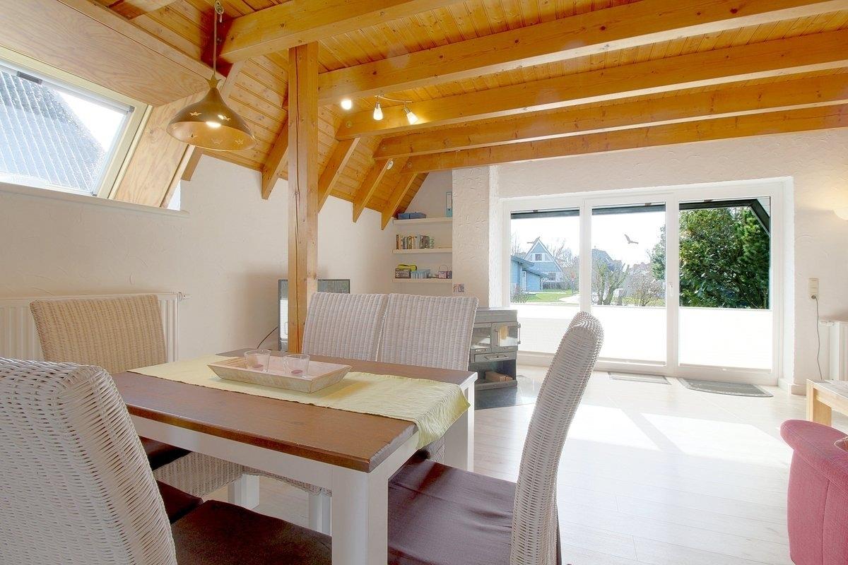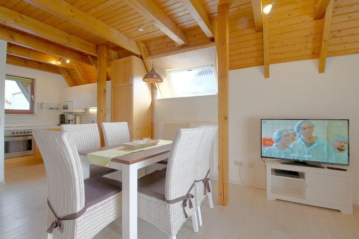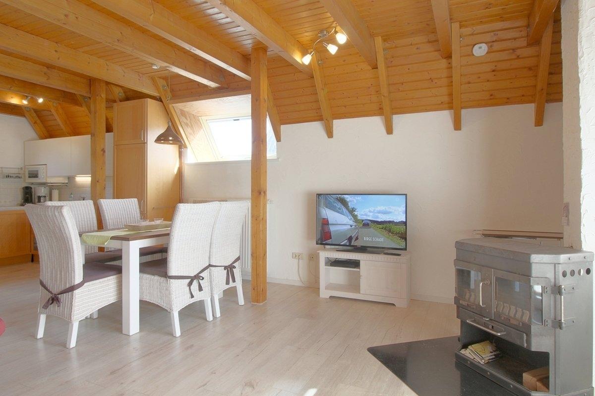 Der Wohnbereich mit Kaminofen, großem Flat-TV, Telefon und kostenlosem Internet (Glasfaseranschluss) bietet genügend Platz für die Familie. Einen Hochstuhl finden Sie ebenfalls im Haus.