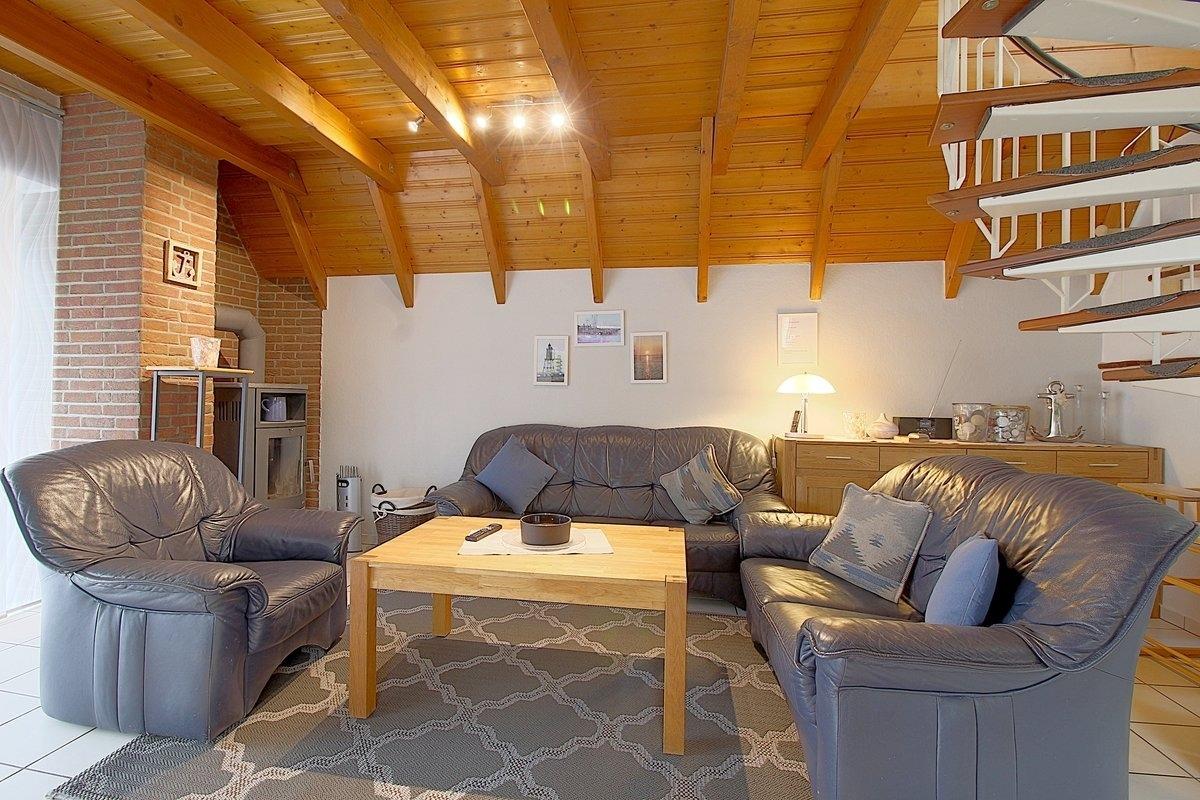 Im modern gestalteten, im Erdgeschoss komplett gefliesten Haus gibt es einen offenen Wohnbereich mit Flat-TV, Kaminofen für die kältere Jahreszeit, Essplatz und Küche mit komplett ausgestatteter moderner Einbauküche. Vom Wohnraum aus geht es direkt auf die Terrasse.