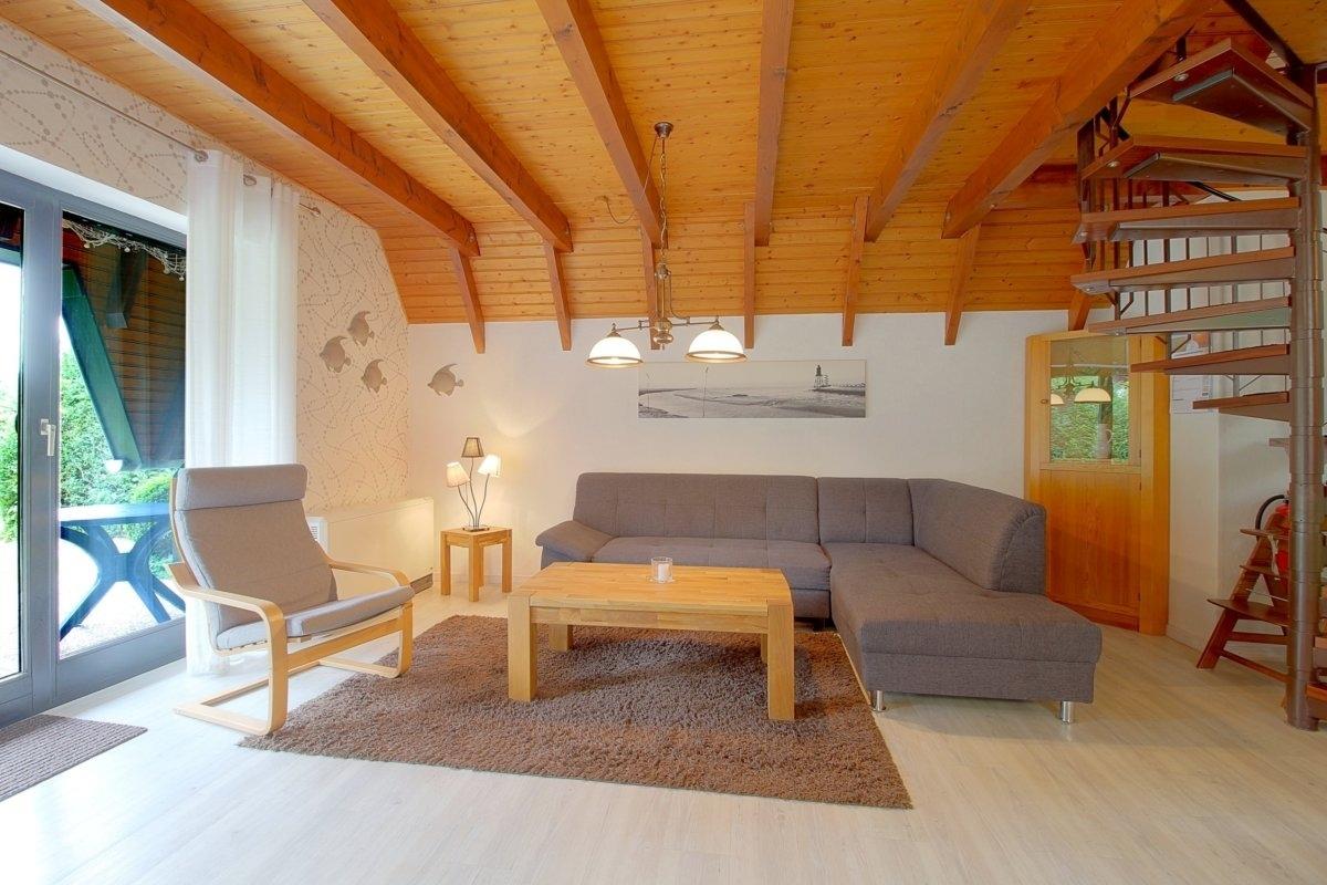 Im Obergeschoß sind die zwei Schlafräume und ein zweites WC mit Handwaschbecken (Kalt- und Warmwasser). Im Elternschlafzimmer ist ein Doppelbett, ein zusätzliches Kinderreisebett und ein zweiter Fernseher. Das Kinderzimmer (kann auch von Erwachsenen benutzt werden) hat zwei Einzelbetten.