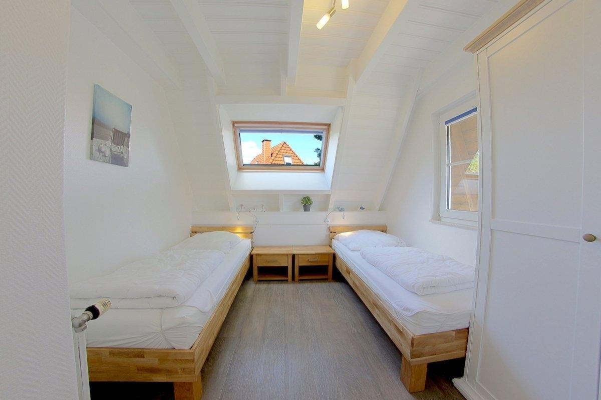Ein Schlafzimmer mit 2 Einzelbetten und das Duschbad mit Waschmaschine befinden sich ebenfalls im Erdgeschoss.