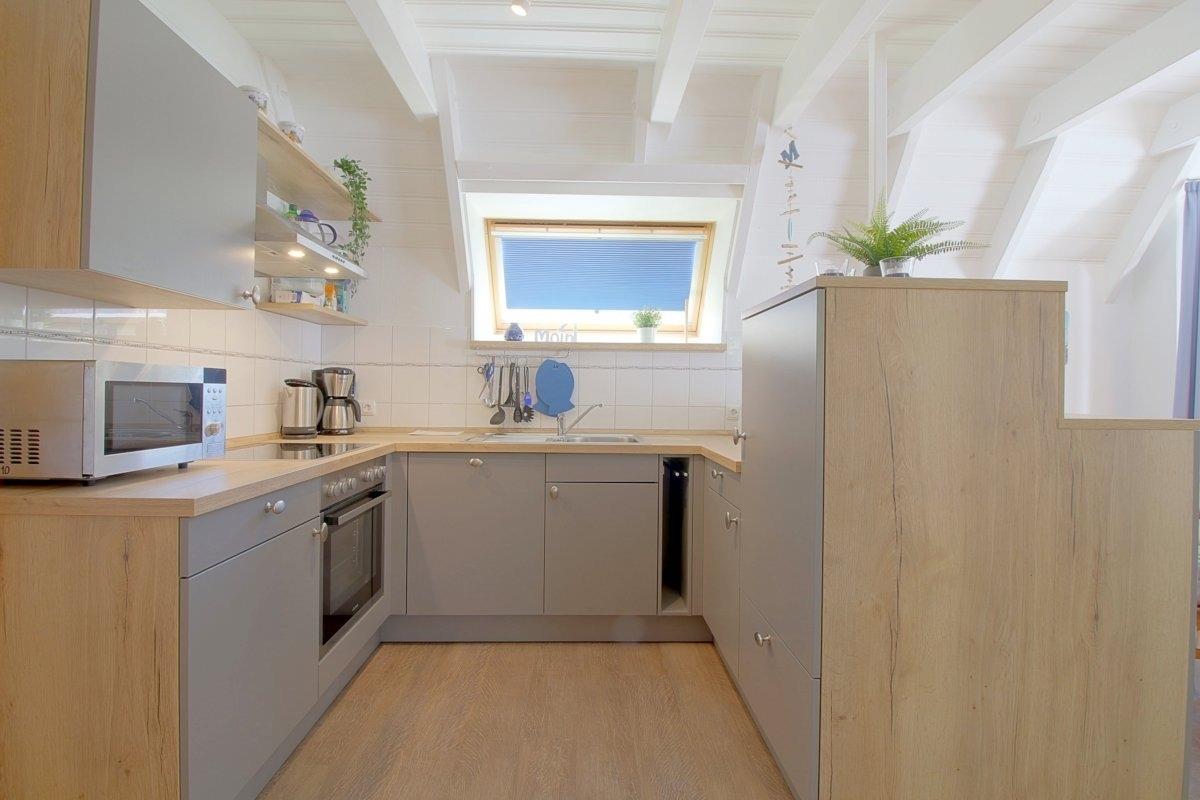 Im Erdgeschoss befindet sich der helle, offene Wohn-, Küchen - und Essbereich mit Ausgang zur Terrasse. Der Kaminofen sorgt in der kühlen Jahreszeit für ein wohliges Raumklima. Die moderne Einbauküche läßt keine Wünsche offen, hier kann der Hobbykoch leckere Gerichte zubereiten.