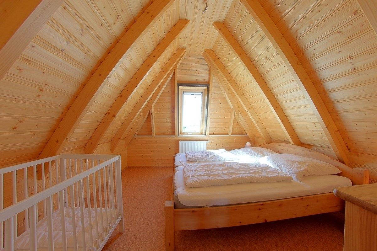 Im Obergeschoss befinden sich zwei weitere Schlafzimmer und ein WC mit Waschbecken. Ein Schlafzimmer mit Doppelbett, Babybett für ein Kleinkind und ein weiteres Schlafzimmer mit 2 Einzelbetten.