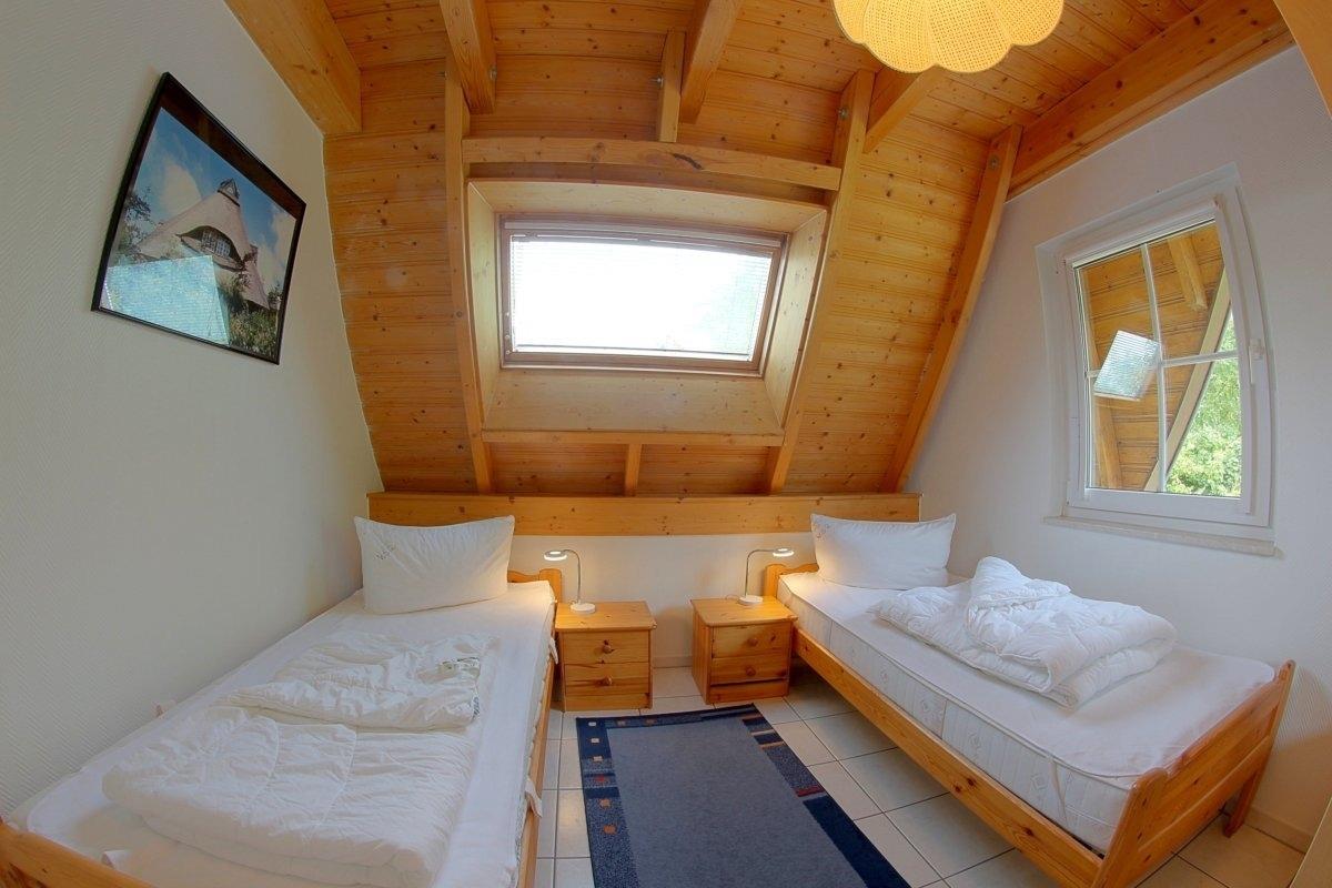 Ein Schlafzimmer mit 2 Einzelbetten und das helle Duschbad mit WC ist ebenfalls im Erdgeschoss.