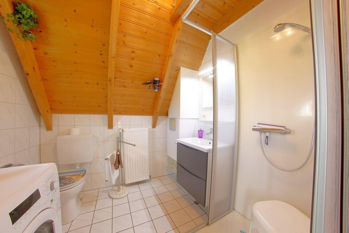 Im Erdgeschoss befinden sich das Bad mit Dusche u. Hocker, ein Schlafzimmer mit 2 Einzelbetten (nicht verschiebbar), und der offen gestaltete Wohn- u. Essbereich mit Küche.