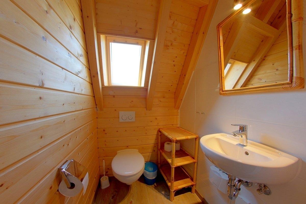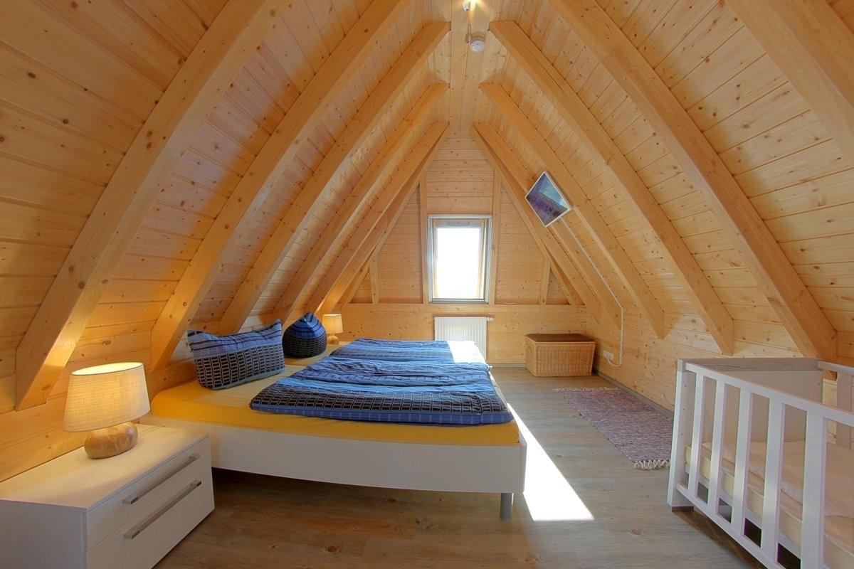 Im Obergeschoss befindet sich ein großes Schlafzimmer mit Doppelbett, Babybett und TV, sowie ein weiteres Schlafzimmer mit 2 Einzelbetten und ein zusätzliches WC.