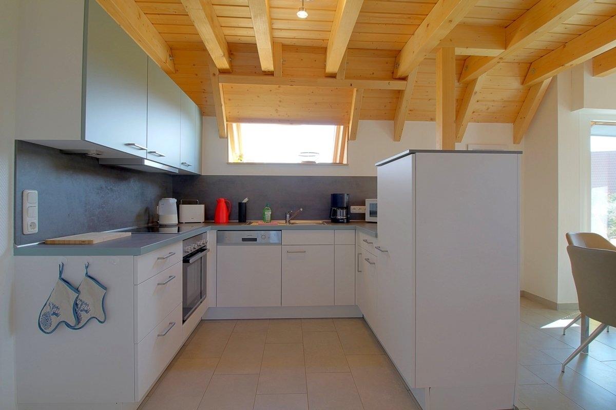 Die Küche ist komplett ausgestattet, hier kann der Smutje leckere Gerichte zaubern. Der Essplatz für bis zu 6 Personen bietet Platz für die ganze Familie. Ein modernes Duschbad mit Tageslicht, Dusche mit Flacheinstieg, Handtuchheizung und Waschmaschine befinden sich ebenfalls im Erdgeschoss.