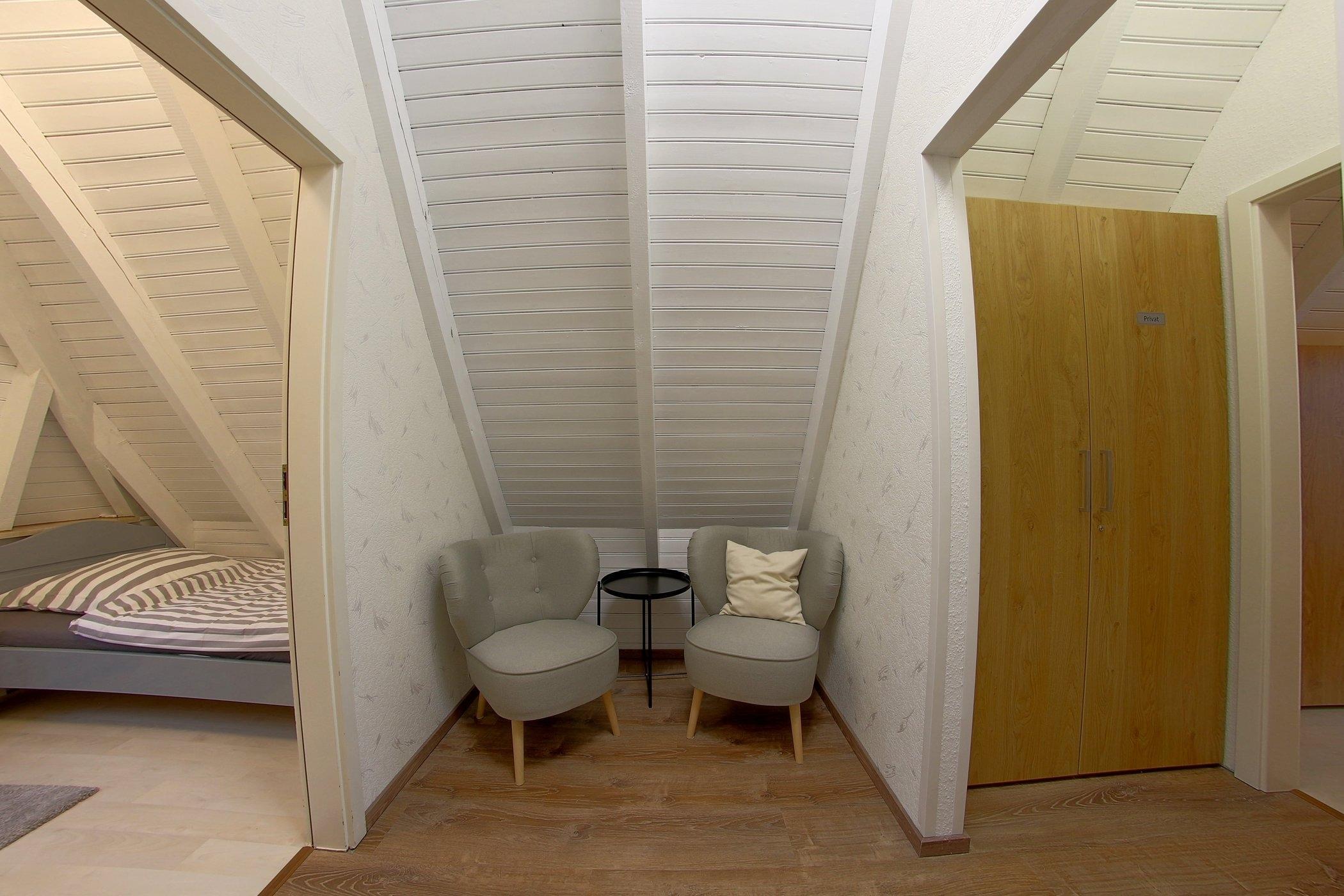 Die Schlafräume sind durch einen kleinen Aufgang mit gemütlichen Sesseln verbunden, die zum lesen und Verweilen einladen.