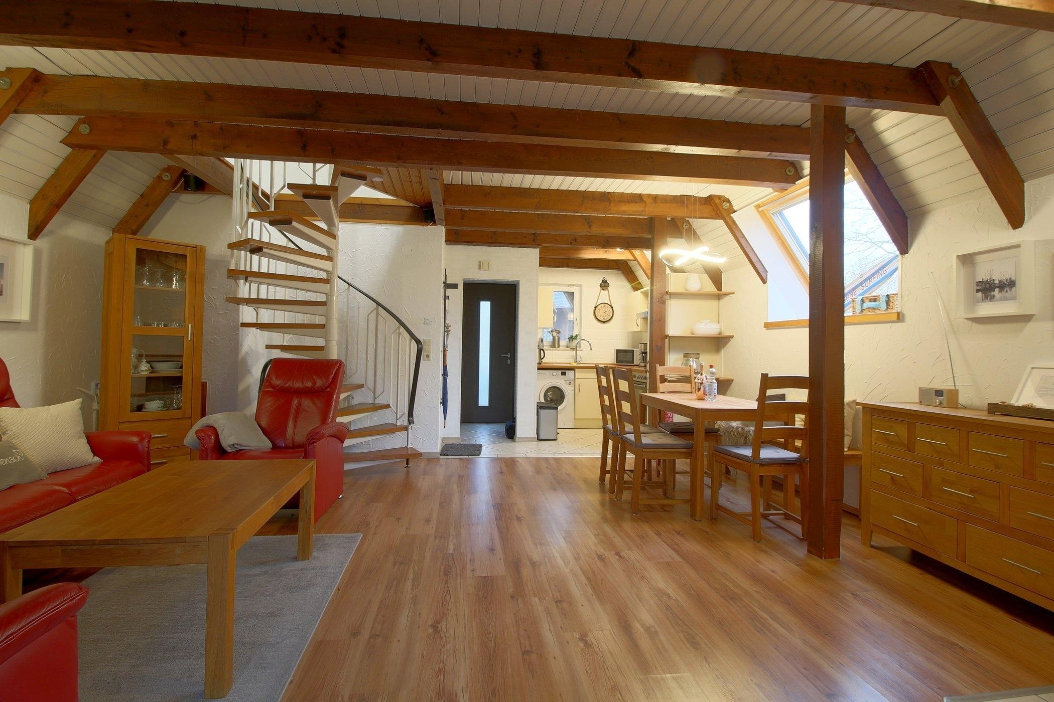 Kamin, Kostenloses WLAN, bequemes Sofa mit zwei Relax Sesseln, helle freundliche Sitzecke mit vier Stühlen, Gesellschaftsspiele und Bücher für Erwachsene und Kinder, Full-HD TV