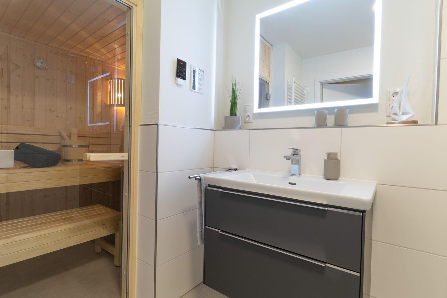 Das helle Bad bietet eine komfortable Dusche, Waschtisch, Spiegel, Handtuchwärmer und viel Platz für deine Pflegeprodukte. Ein Haartrockner ist ebenfalls vorhanden.