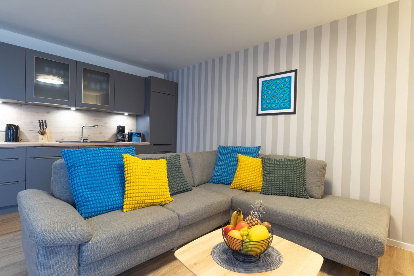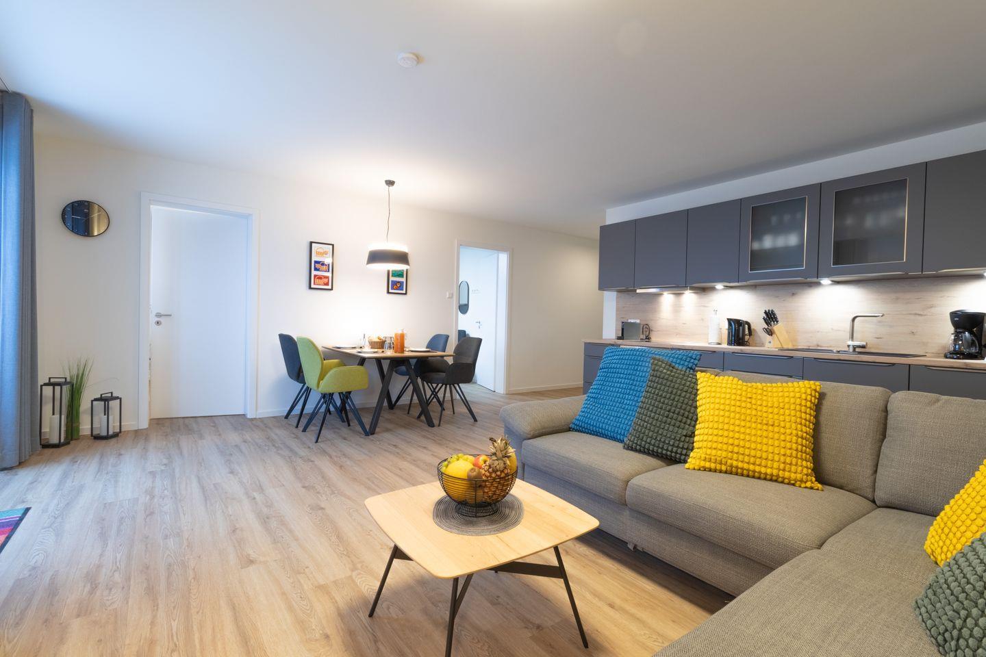 Das Wohnzimmer mit offener Deckengalerie und Sichtbalken schafft ein luftiges Ambiente. Moderne Möbel, ein Smart-TV und die gemütliche Sitzecke laden zum Verweilen ein. Durch die großen Fenster fällt viel Licht – der direkte Zugang zum südlich ausgerichteten Balkon mit Blick über die Dachlandschaft macht den Wohnraum komplett.