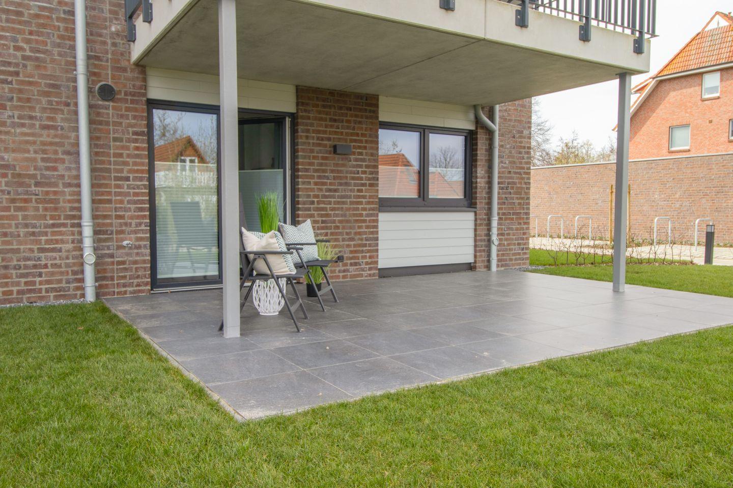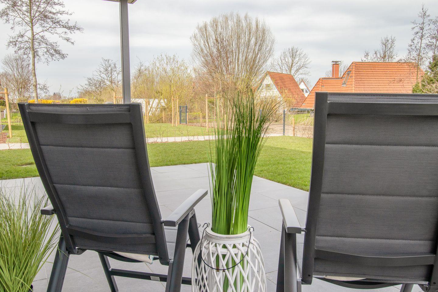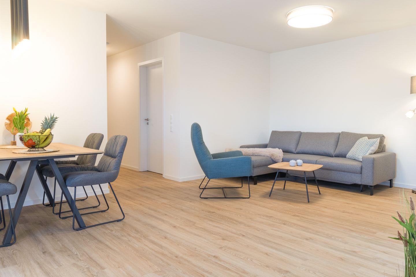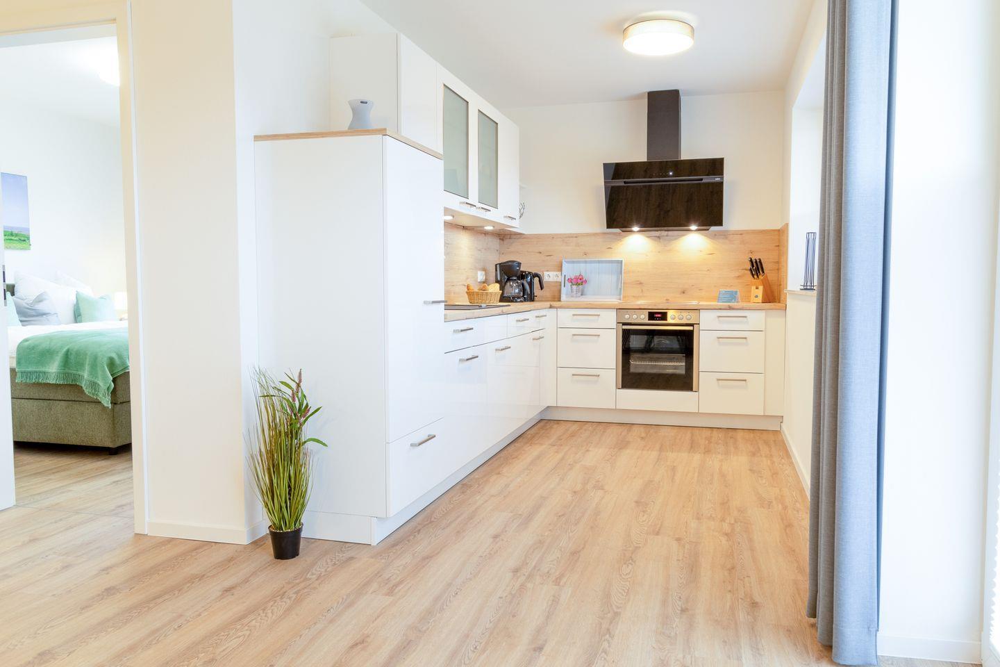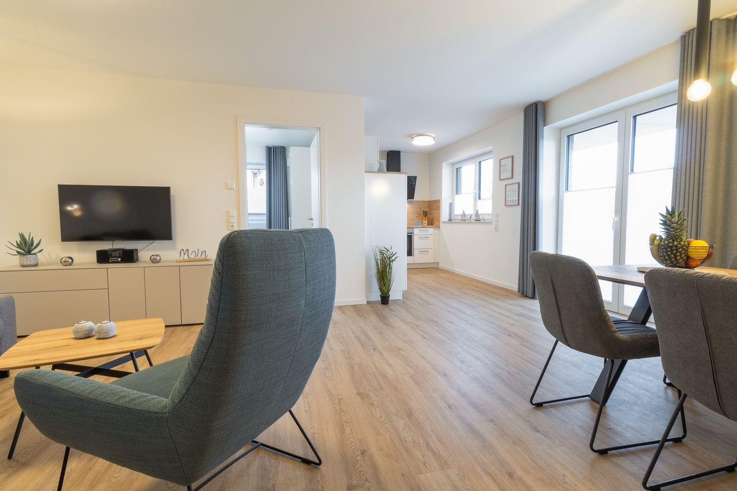 Im offenen Wohnbereich mit Schlafsofa, Relaxsessel und bodentiefen Fenstern kannst du dich wunderbar entspannen. Die angrenzende, voll ausgestattete Küche mit Essplatz lädt zu gemeinsamen Mahlzeiten ein. Von hier gelangst du direkt auf die möblierte Terrasse mit kleinem Garten – perfekt für sonnige Stunden an der frischen Seeluft.