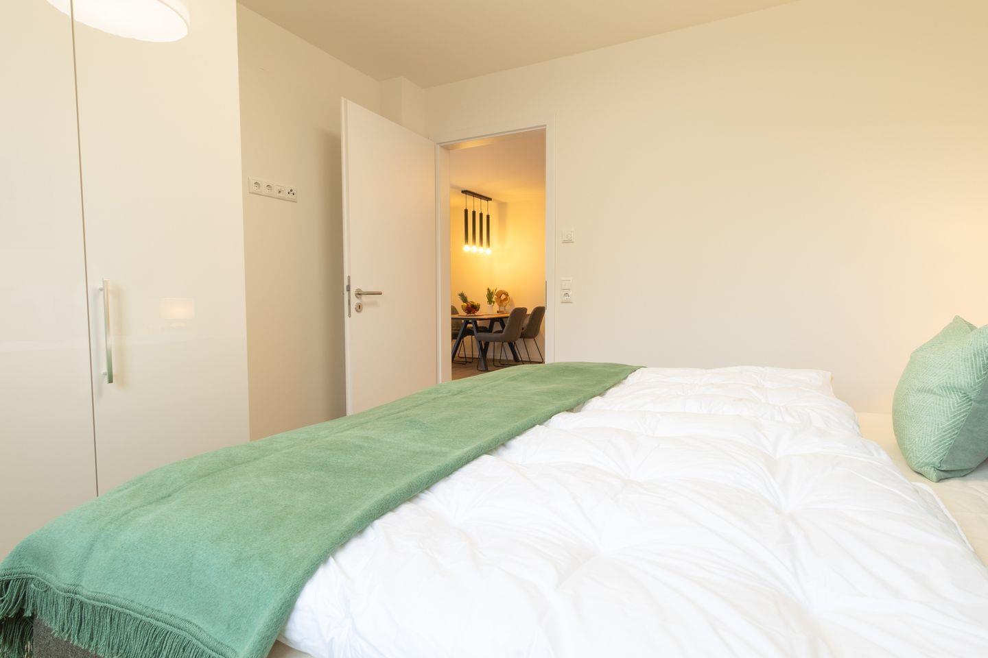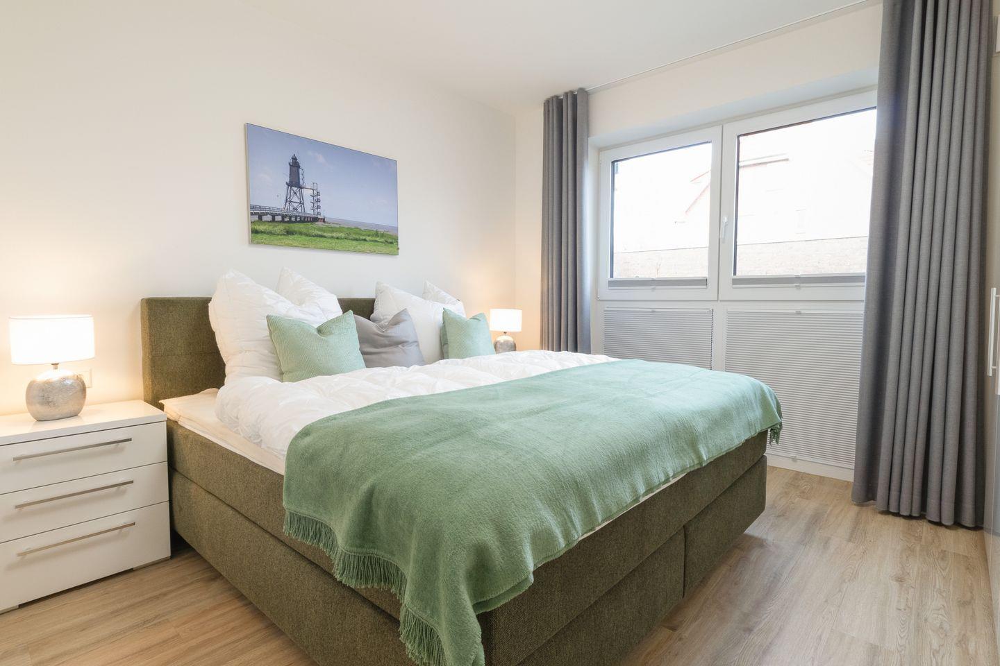 Im separaten Schlafzimmer schläfst du im komfortablen Boxspringbett. Ein geräumiger Kleiderschrank bietet Platz für deine Garderobe, und Verdunkelungsplissees sorgen für erholsame Nächte.