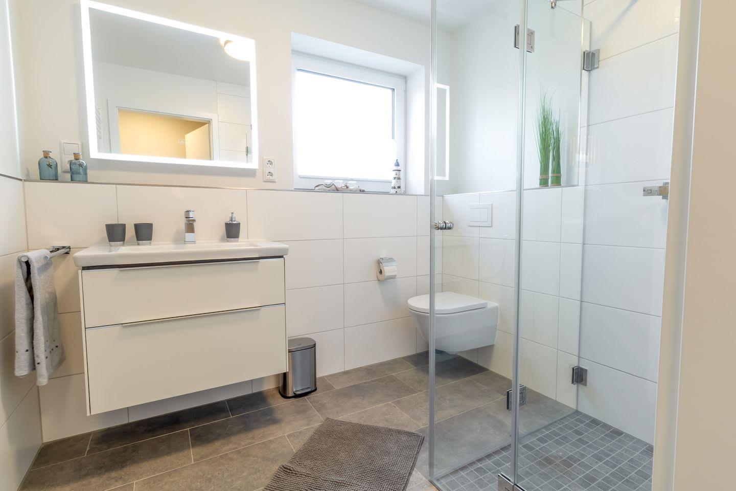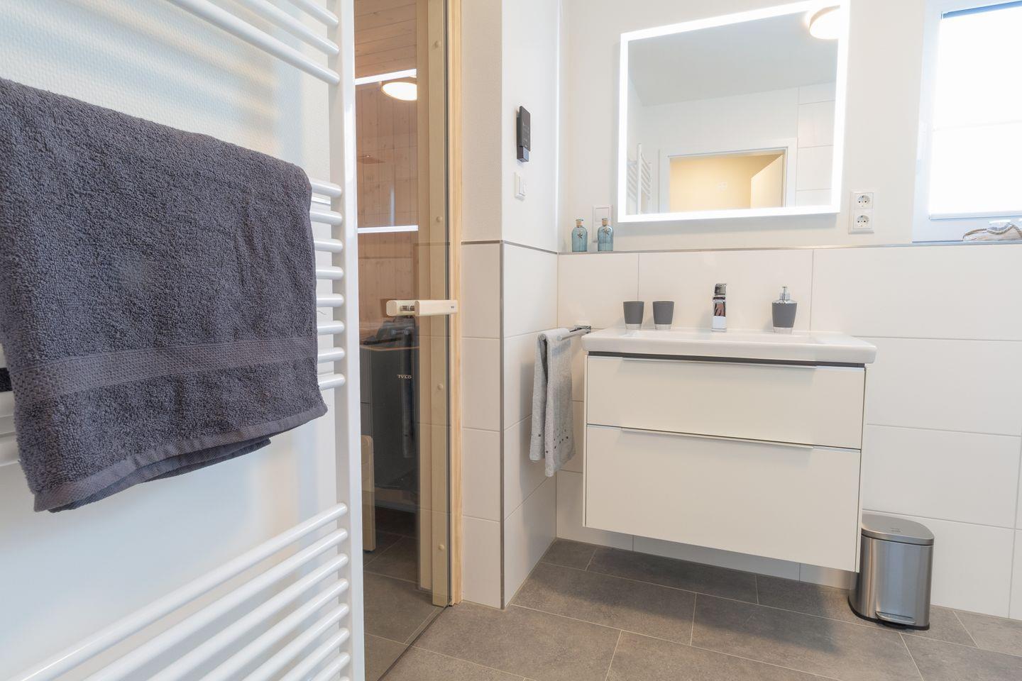 Das moderne Badezimmer ist deine private Wohlfühloase – mit bodentiefer Dusche und exklusiver Sauna für entspannende Momente nach einem Tag am Meer.
