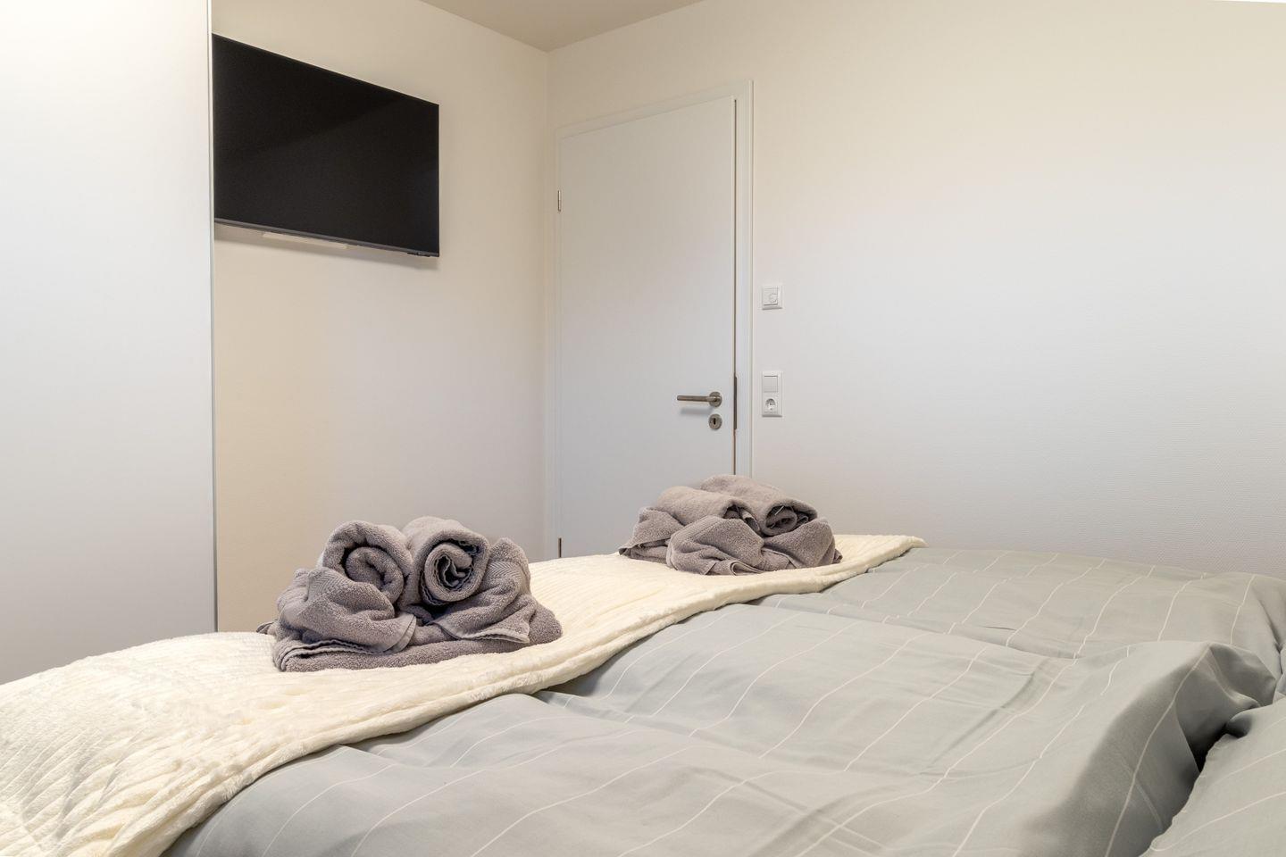 Das separate Schlafzimmer ist mit einem komfortablen Doppelbett und einem Kleiderschrank ausgestattet. Hier findest du die nötige Ruhe für erholsame Nächte.