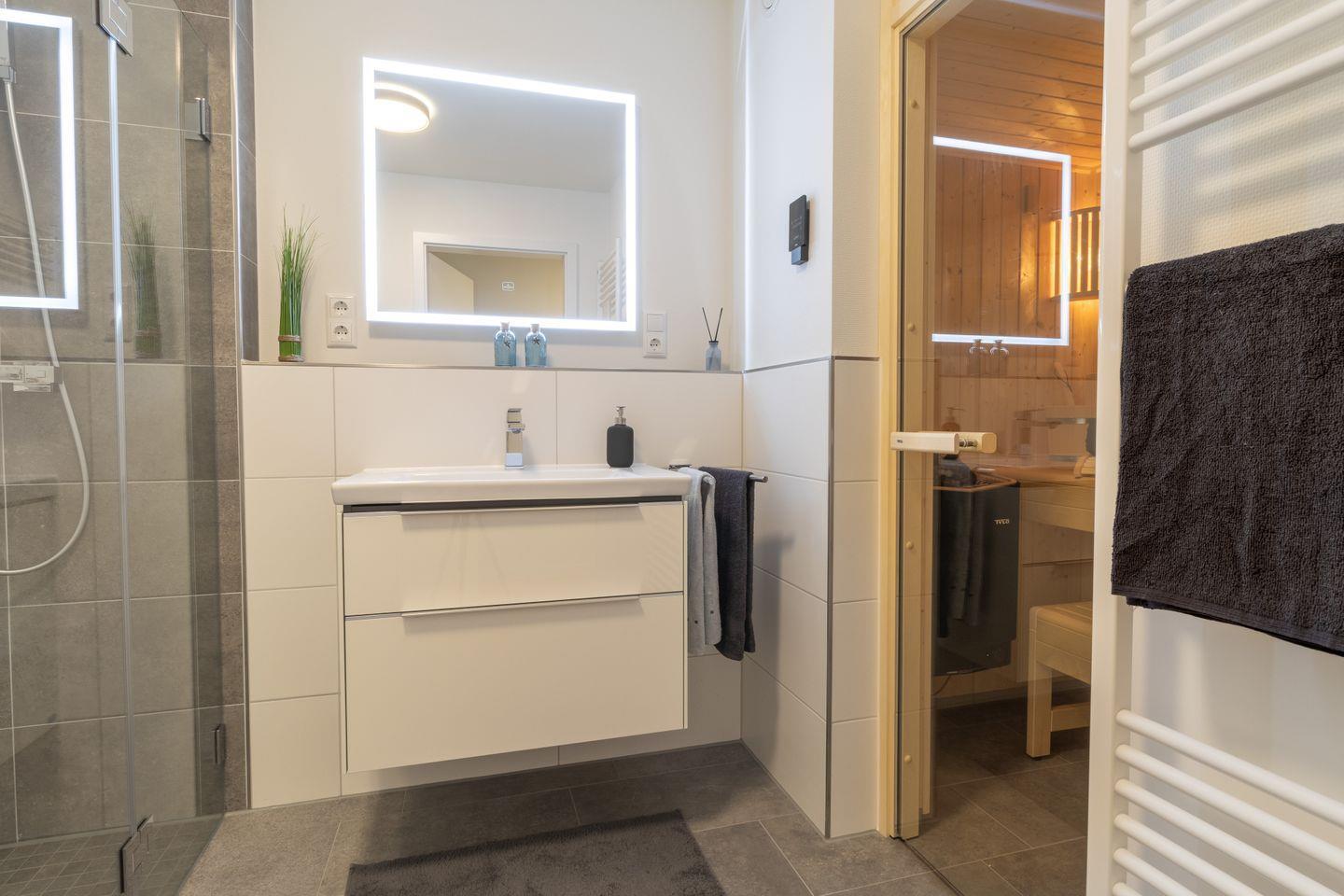 Das modern gestaltete Badezimmer verfügt über eine Dusche, ein Waschbecken und ein WC. Hell, funktional und gepflegt – für einen gelungenen Start in den Tag.
