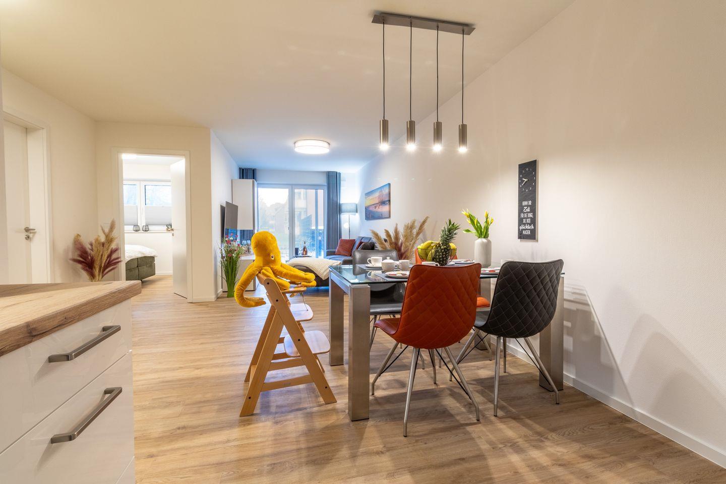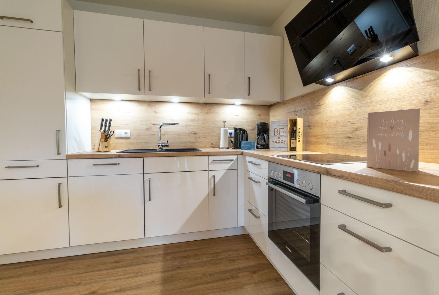 Im hellen Wohnbereich erwartet dich eine gemütliche Couch, ein Flachbild-TV und ein Essplatz am Fenster. Die offene Küche ist mit allem ausgestattet, was du für deinen Aufenthalt brauchst – ideal für entspannte Urlaubstage zu zweit.