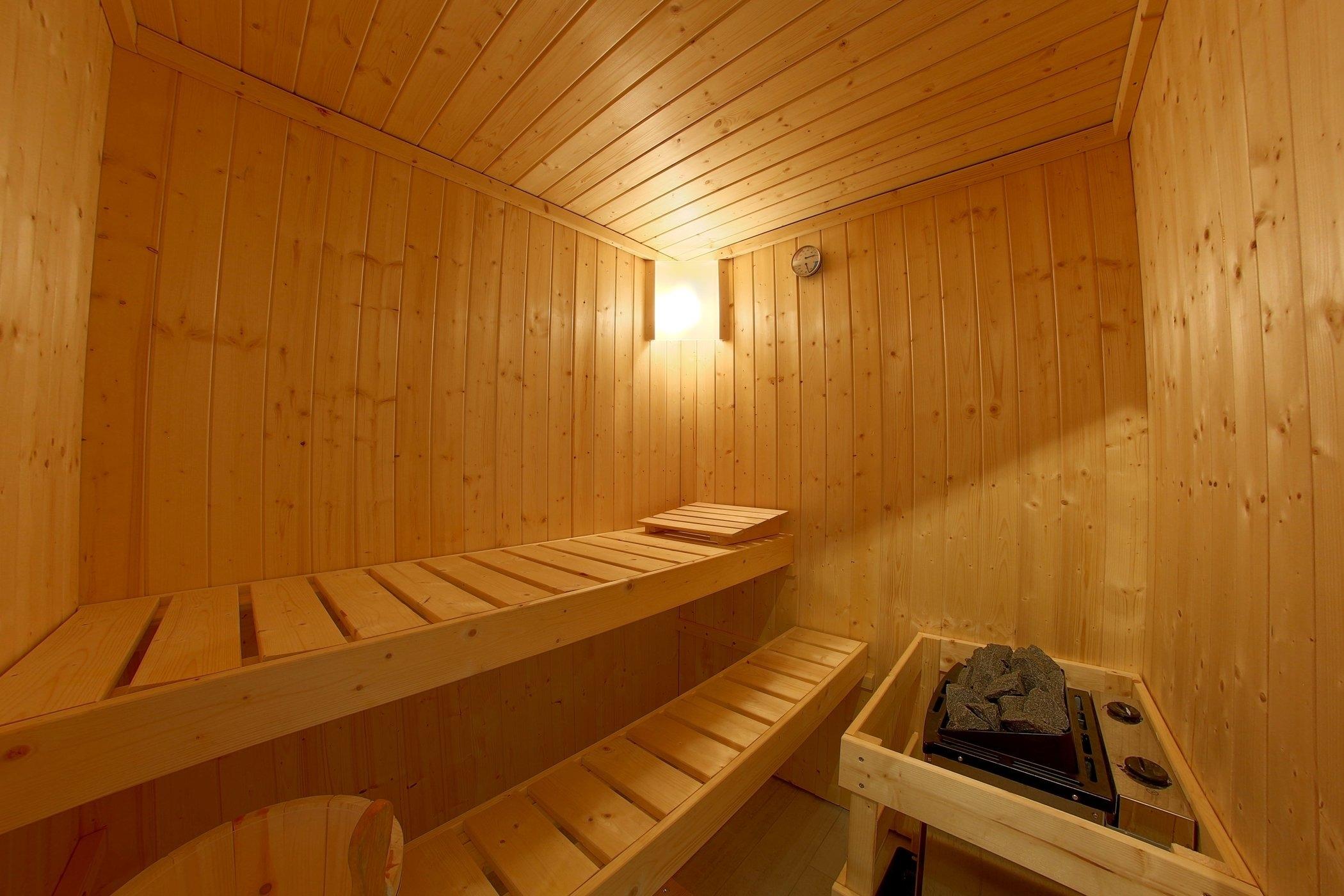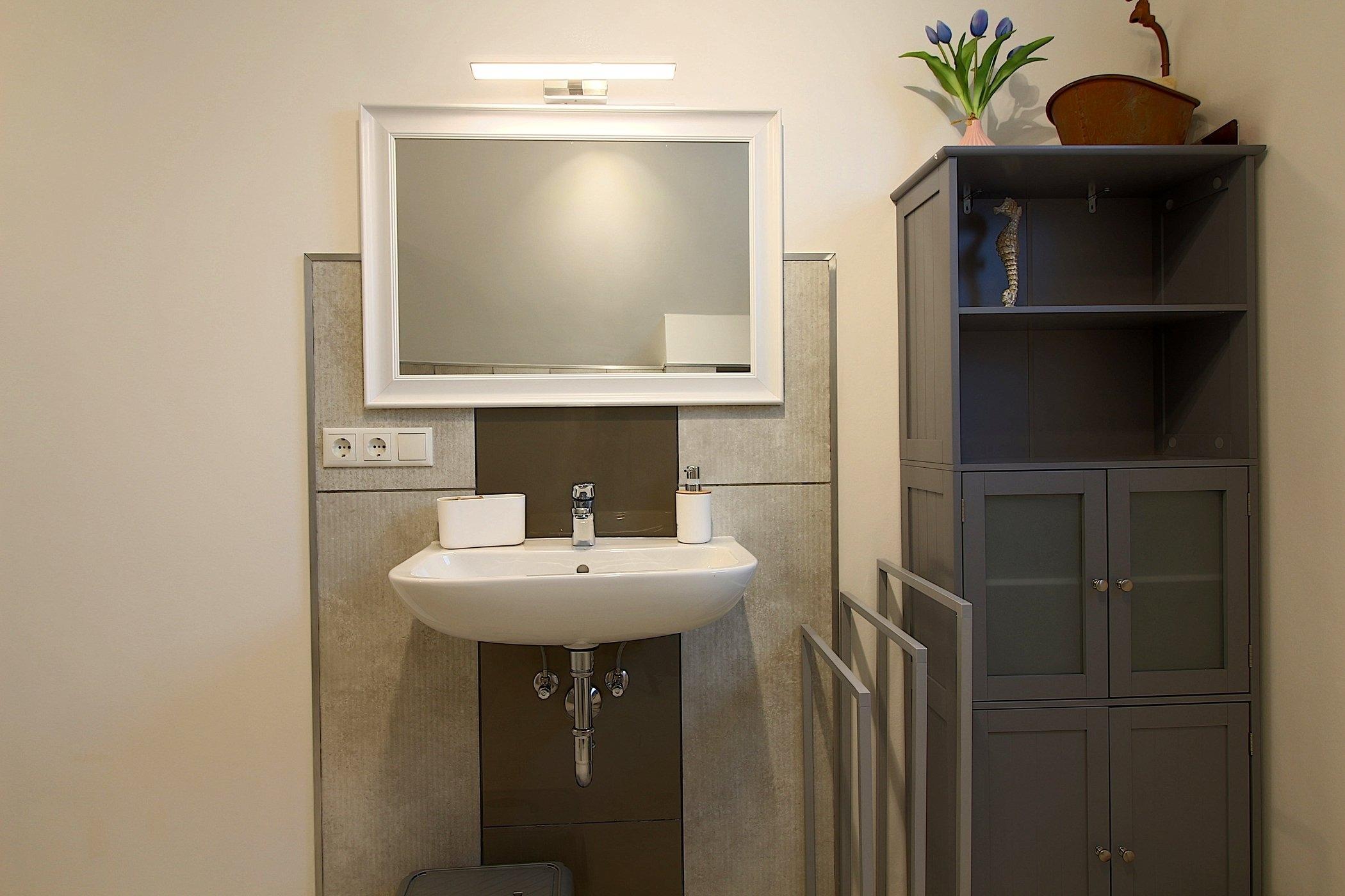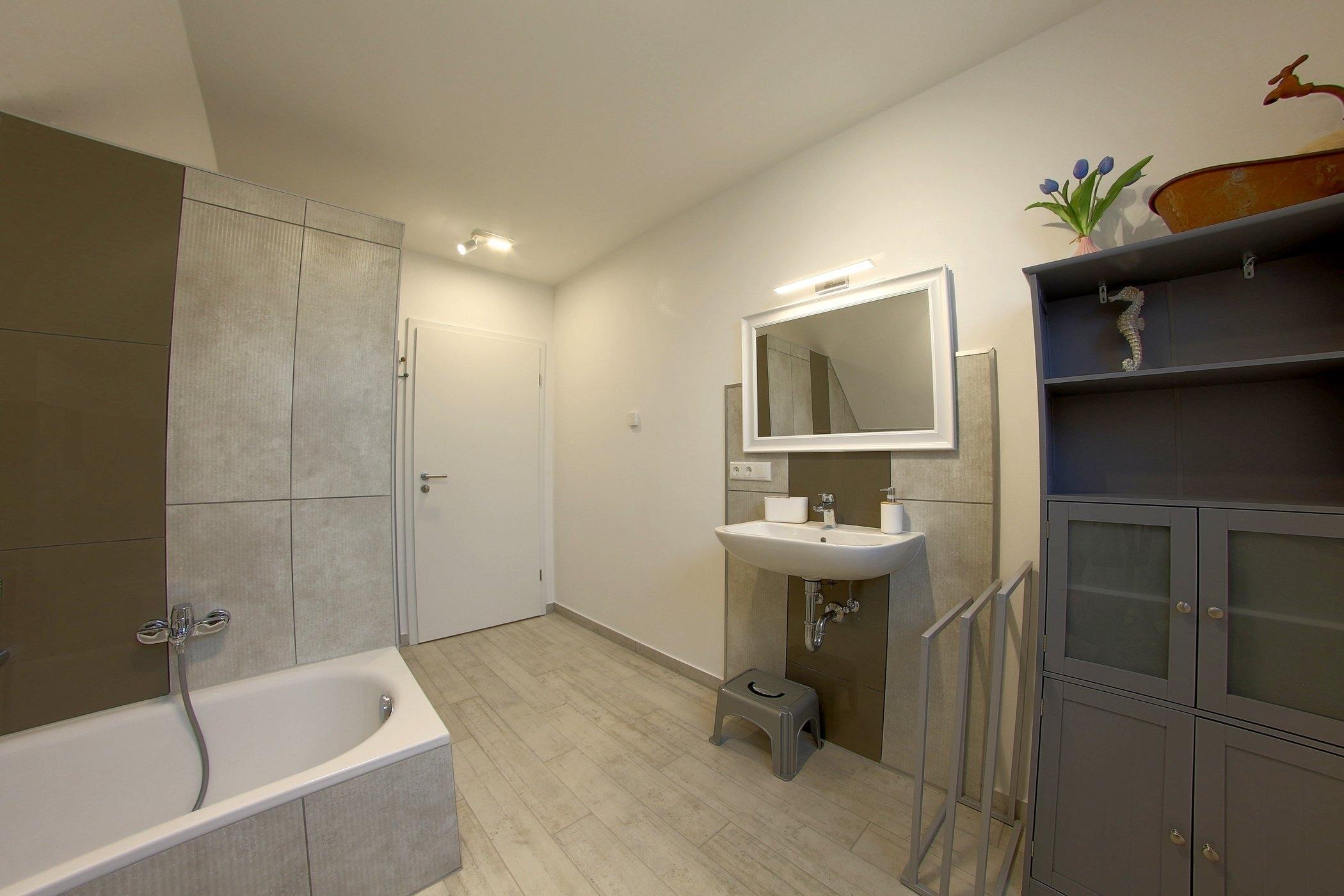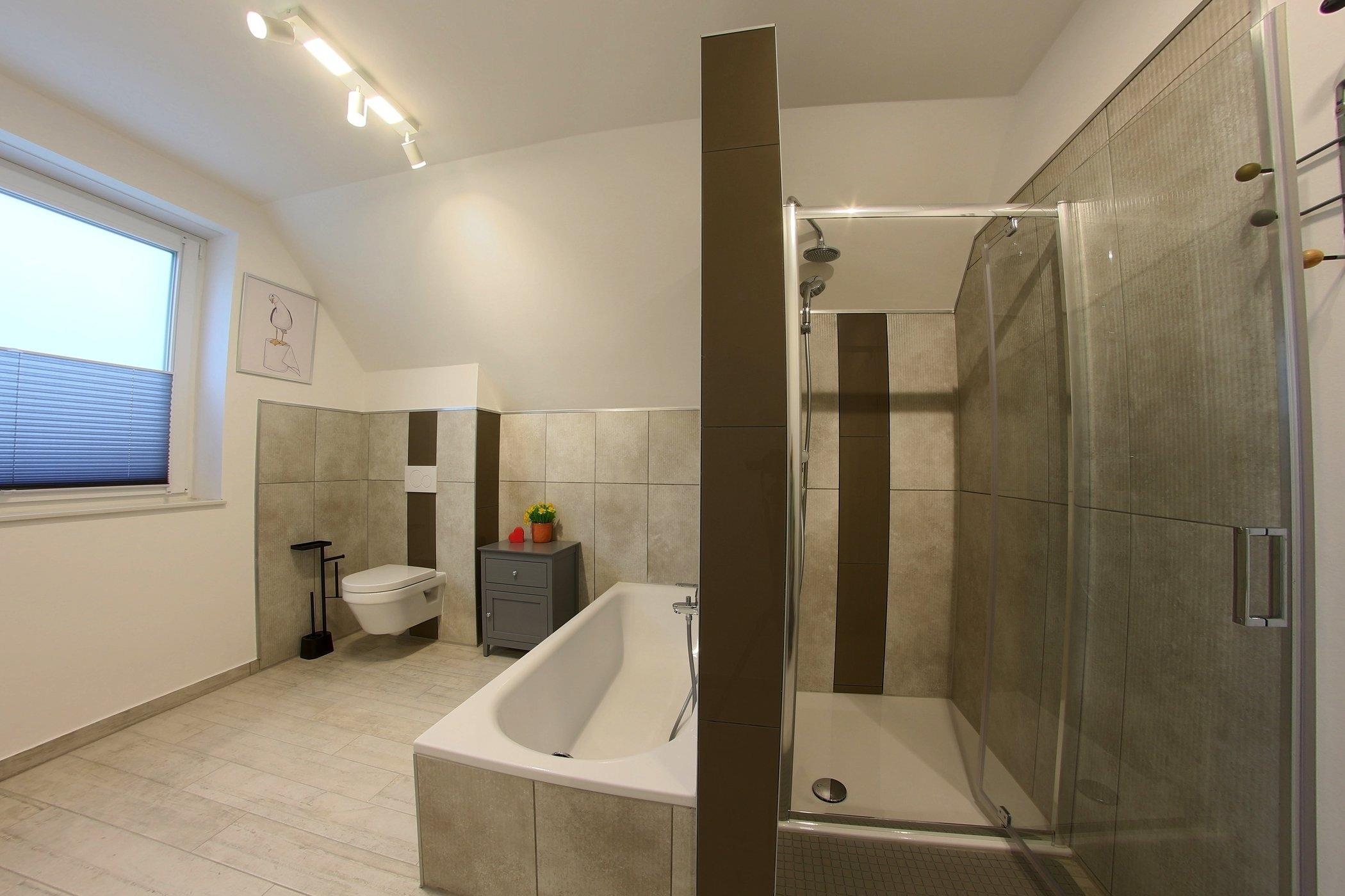 Im Erdgeschoß gibt es ein schickes Duschbad mit Sauna und im Obergeschoß ein Vollbad mit Fenster für die Gäste. Im Abstellraum draußen gibt es eine Waschmaschine