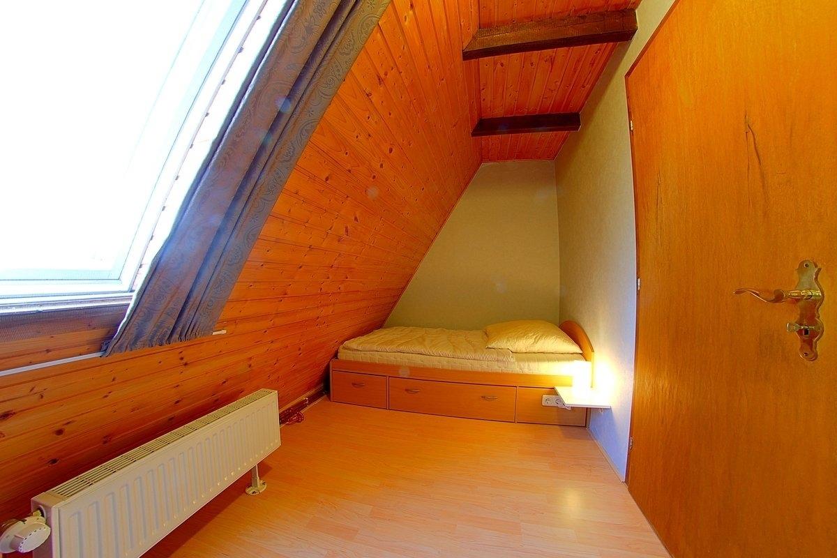 Ein Schlafzimmer im Erdgeschoß mit 2 Einzelbetten (0.80 x 2,00 m), ein Schlafzimmer im Obergeschoß mit Doppelbett (1,80 x 2,00 m) und ein Zimmer mit Einzelbett (0,90 x 1,90 m) und Babyreisebett.