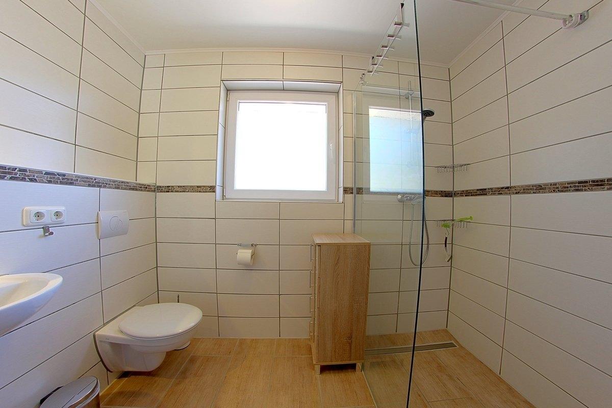 Ein modernes Duschbad mit begehbarer Dusche, Terrasse und Gartennutzung bieten wir unseren Gästen. Für die Kleinen stehen Hochstuhl und Kinderreisebett bereit.
