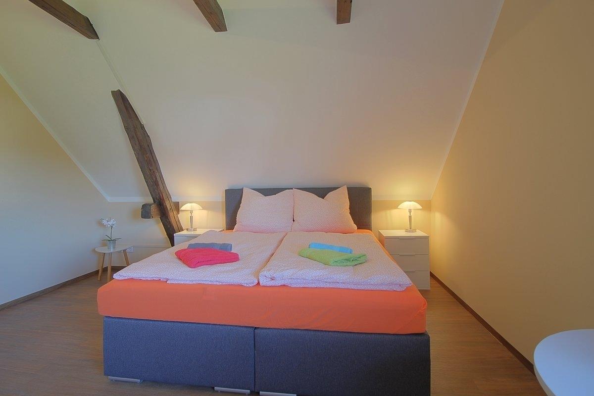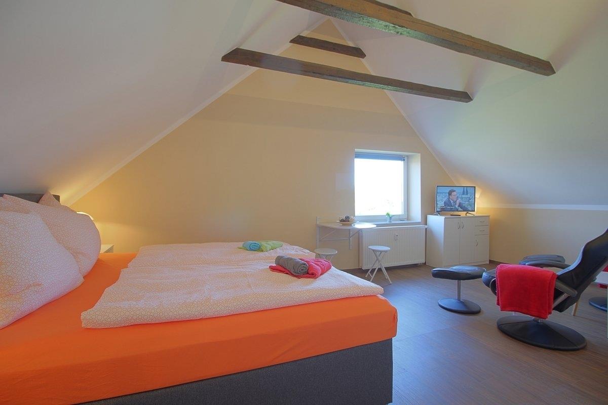 Modern eingerichtetes Doppelzimmer im 2. OG mit offener Decke bis in den Spitzboden mit Sichtbalken. Das gemütliche Boxspringbett welches auch als 2 Einzelbetten gestellt werden kann sorgt für erholsamen Schlaf, 2 Fernsehsessel, großer Flachbild TV, gemeinsame Küchen- und Badezimmernutzung. Vinylbodenbeläge in allen Räume, daher für Allergiker geeignet. Es fehlt an nichts, hier können Sie nach einem anstrengendem Arbeitstasg Ihren Feierabend genießen.