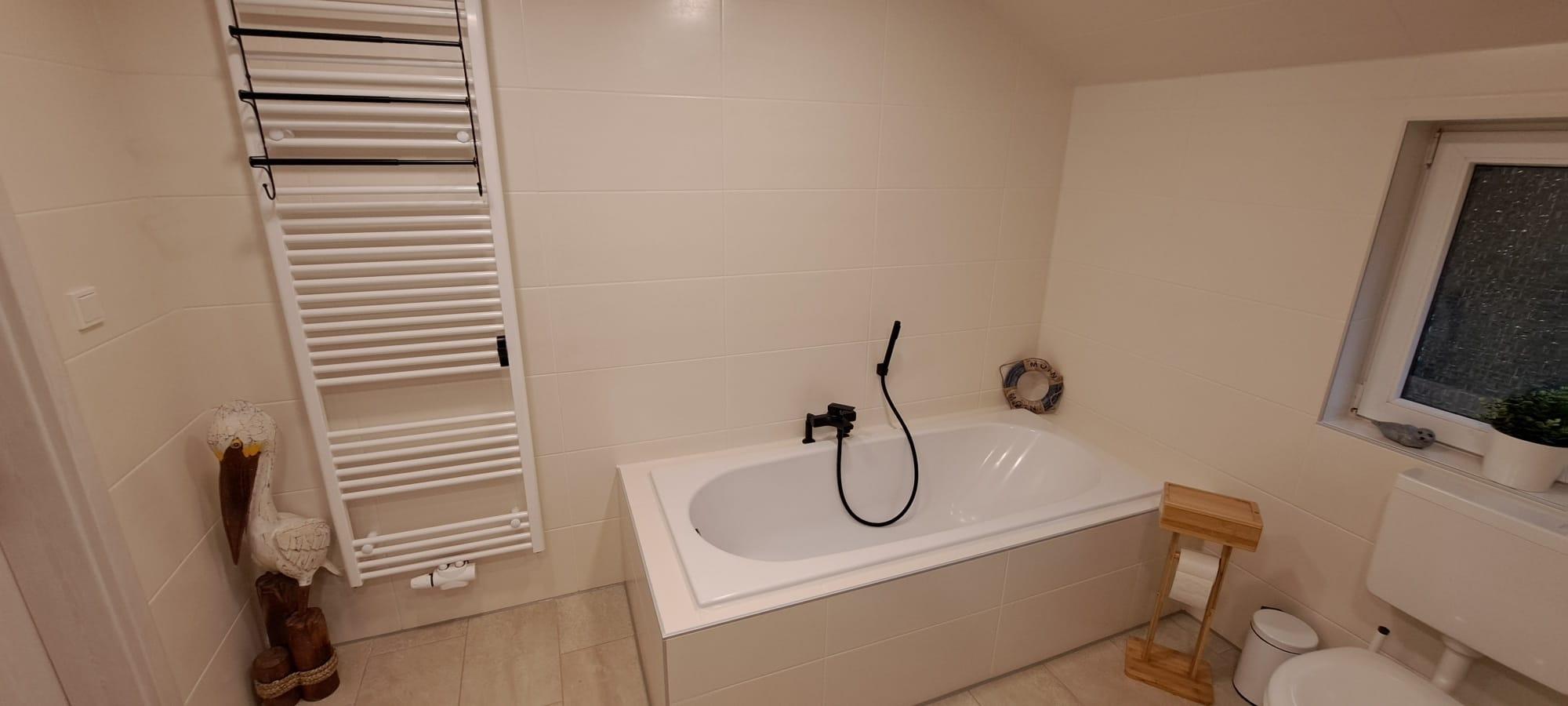 Ein schick modernisiertes Vollbad, Abstellraum mit Waschmaschine und Stellplatz für Ihre Fahrräder sind ebenfalls vorhanden.