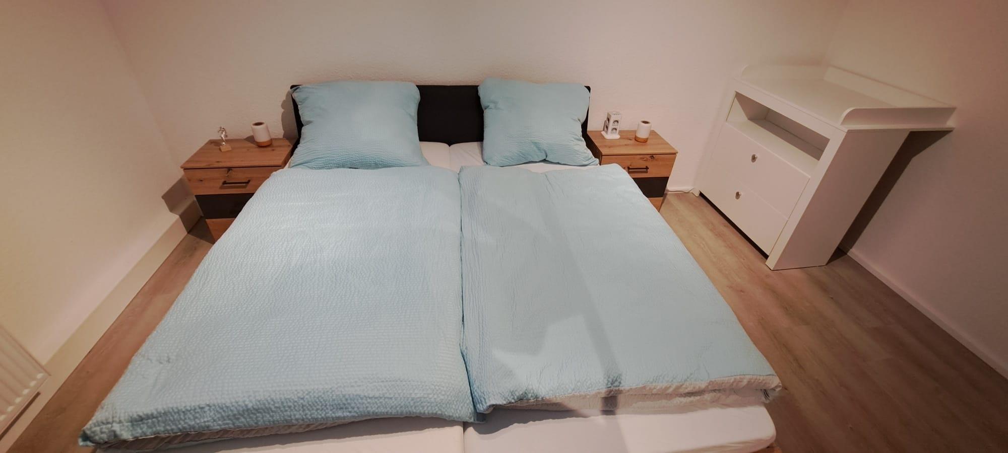 2 Schlafzimmer mit Doppelbett (180 x 200 cm), 1 Schlafzimmer mit 2 Einzelbetten (0,90 x 200 cm). Eine Wickelkommode, Reisebett und Hochstuhl sind ebenfalls vohanden.