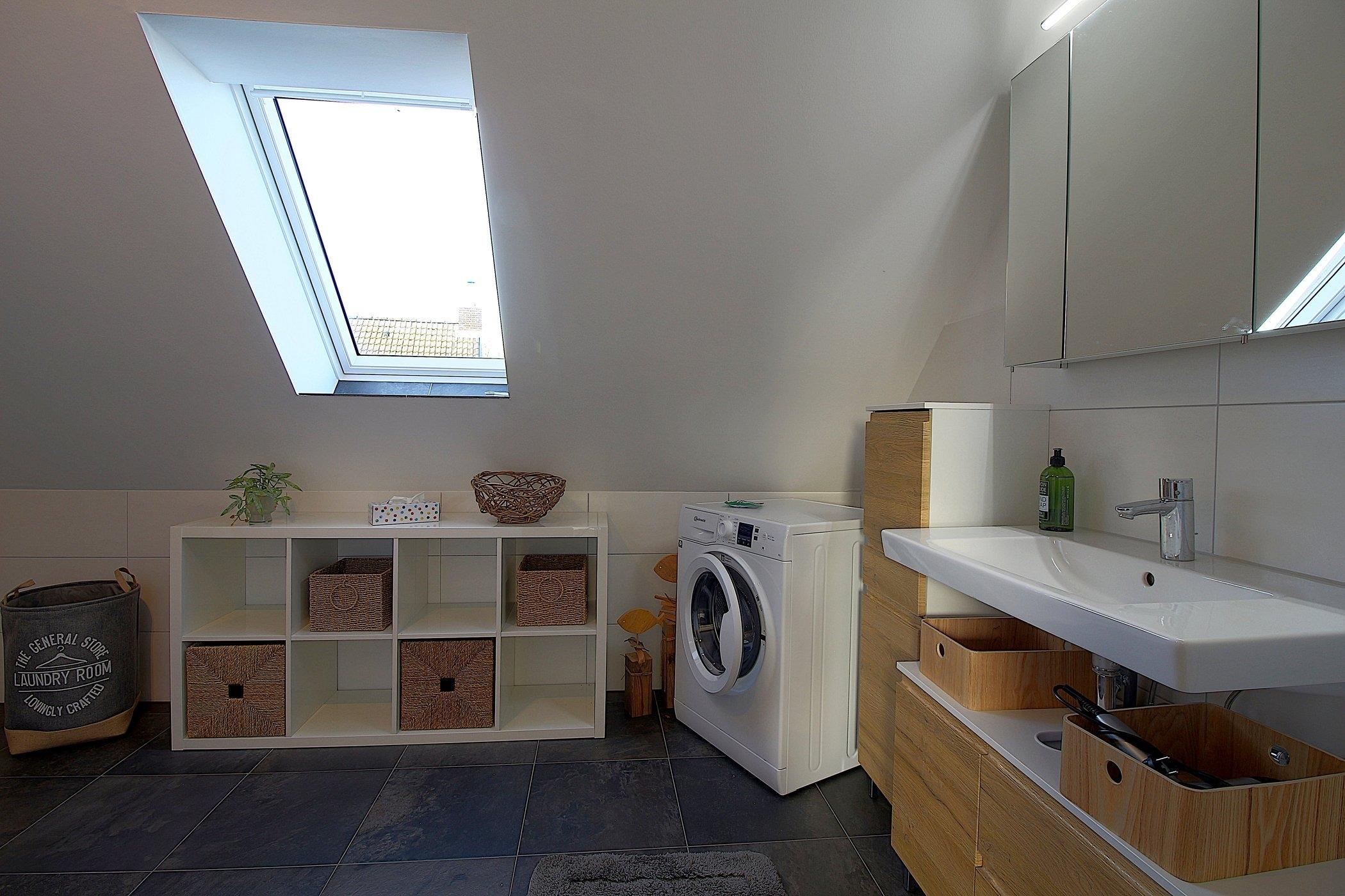Modernes Duschbad mit bodengleicher Dusche, Fenster und Waschmaschine