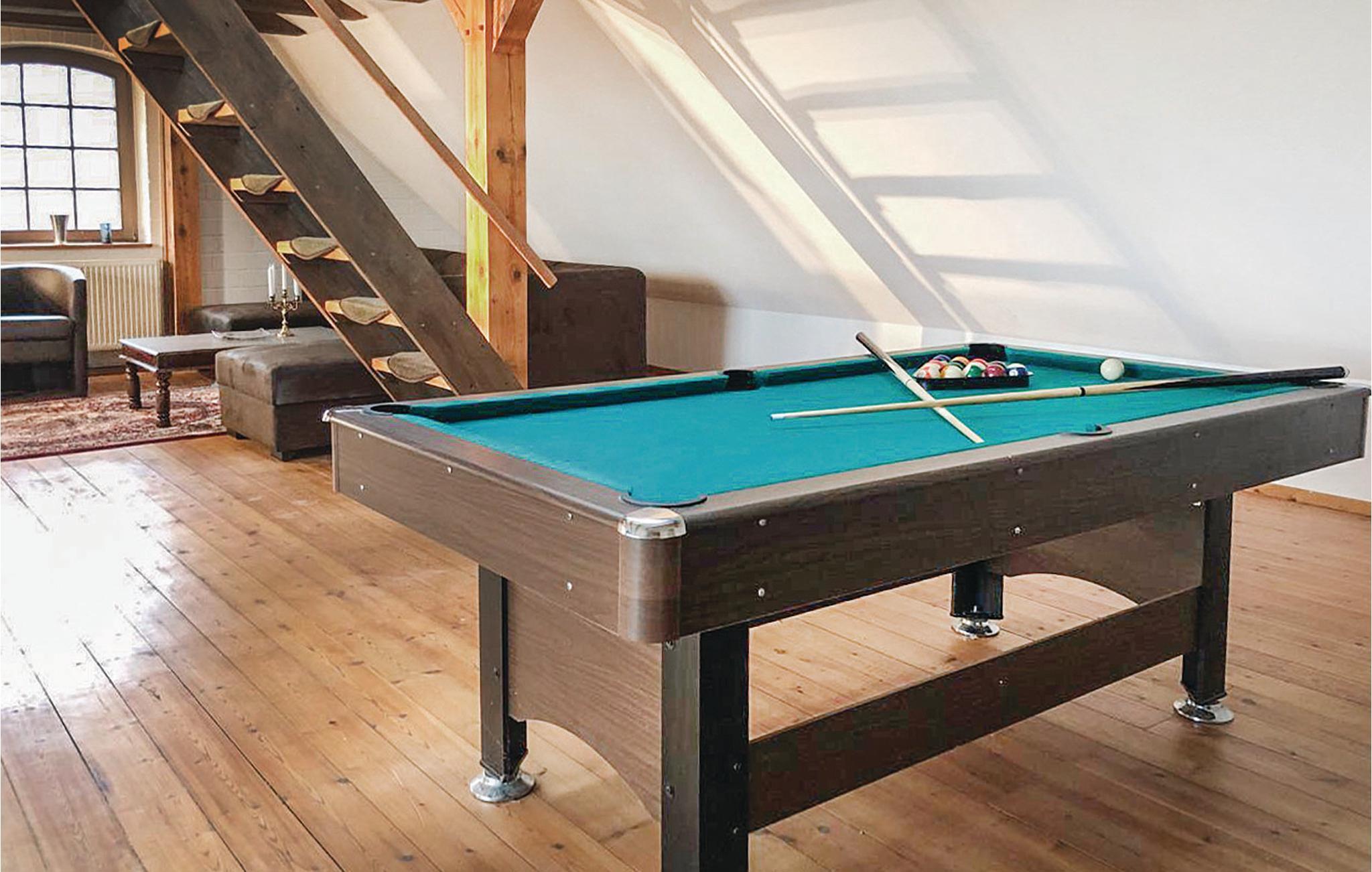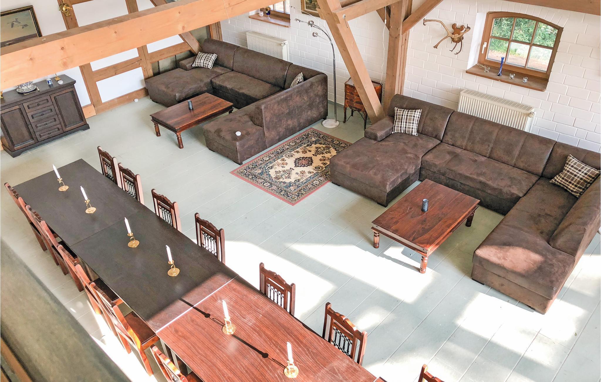 De ti soveværelser strækker sig over fire etager, nogle af dem ligger i forbindelse med en stue. Interieuret er moderne i landhusstil. I underste etage er der en sal til fælles aktiviteter eller fester. Her er god plads til en gruppe der rejser sammen eller til den helt store familie. Her er også bordfodbold, billard og en lille hjemmebiograf. En sauna og et boblebad giver wellness i det udendørs område. Træet til saunavarmeren skal bringes ind efter behov.
