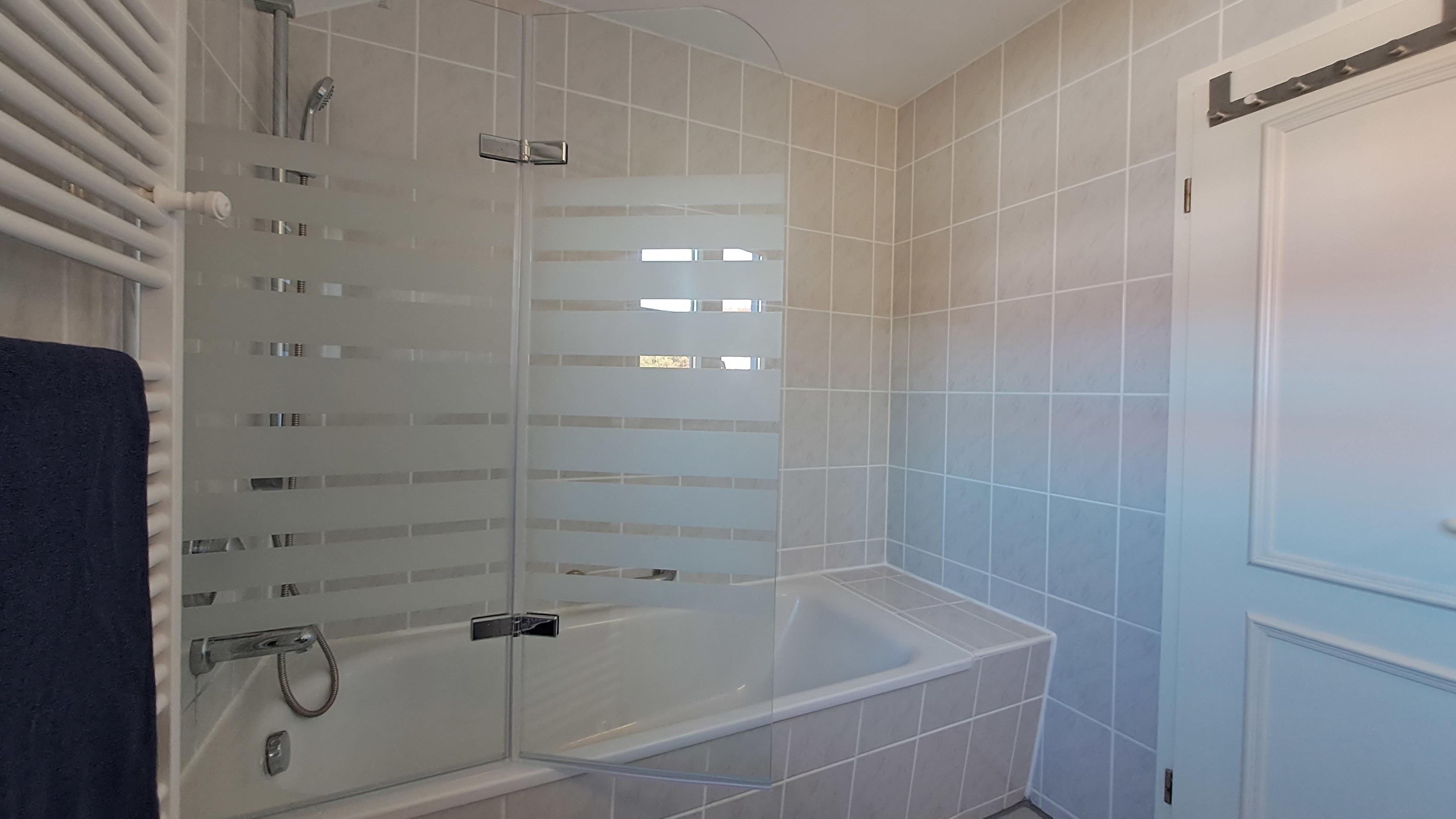 - Badewanne mit Duschwand, Haartrockner, Waschbecken, Spiegel, WC und Handtuchwärmer