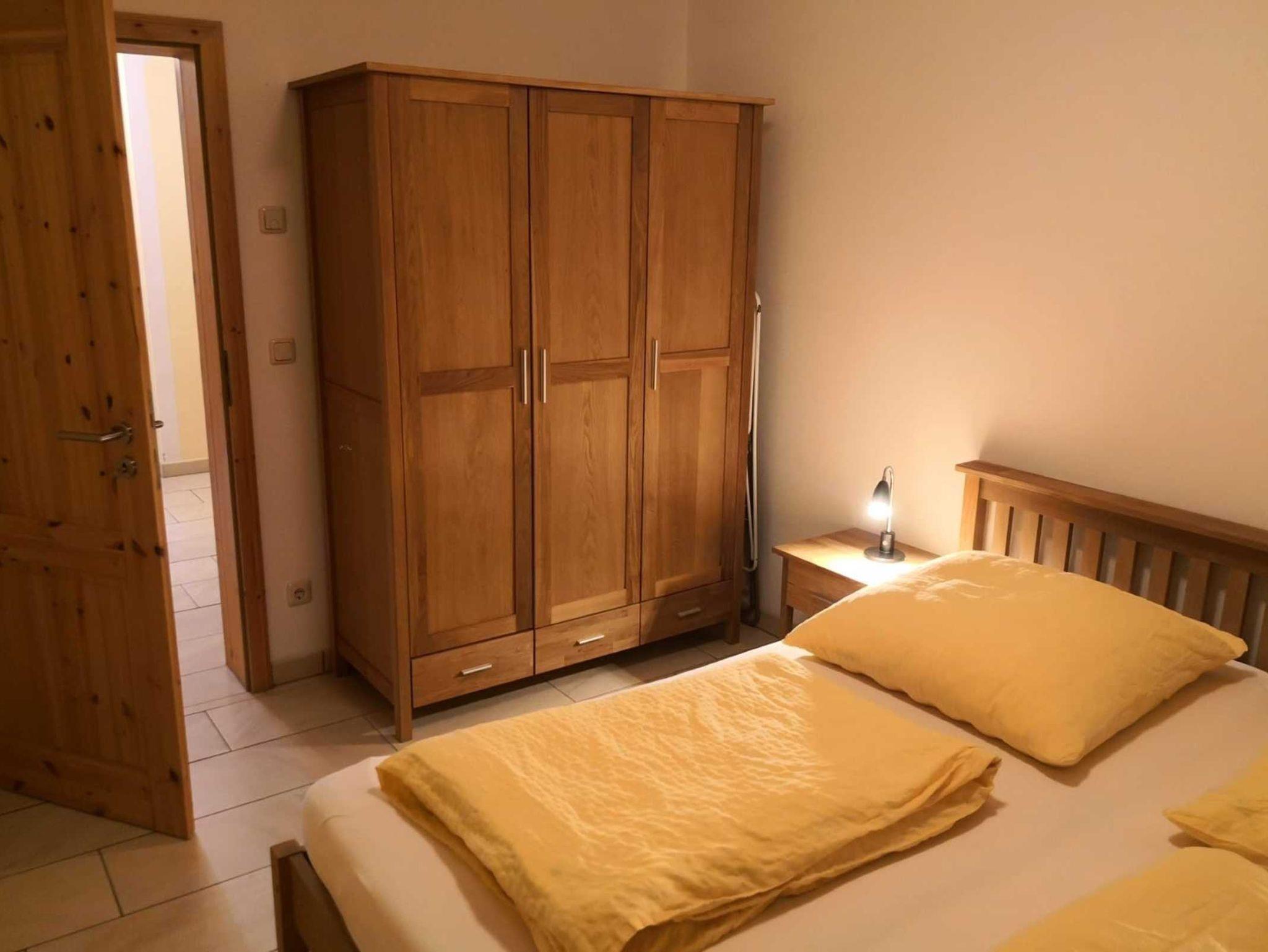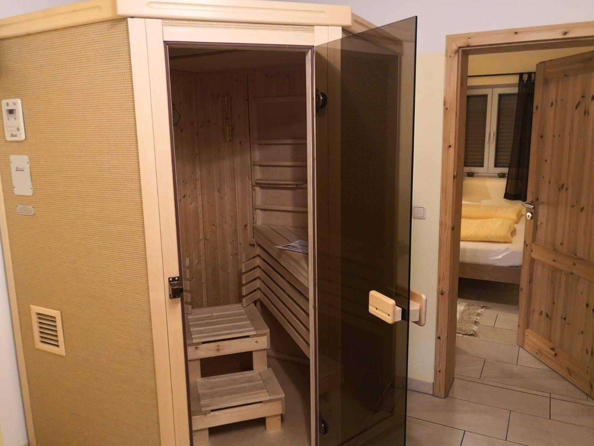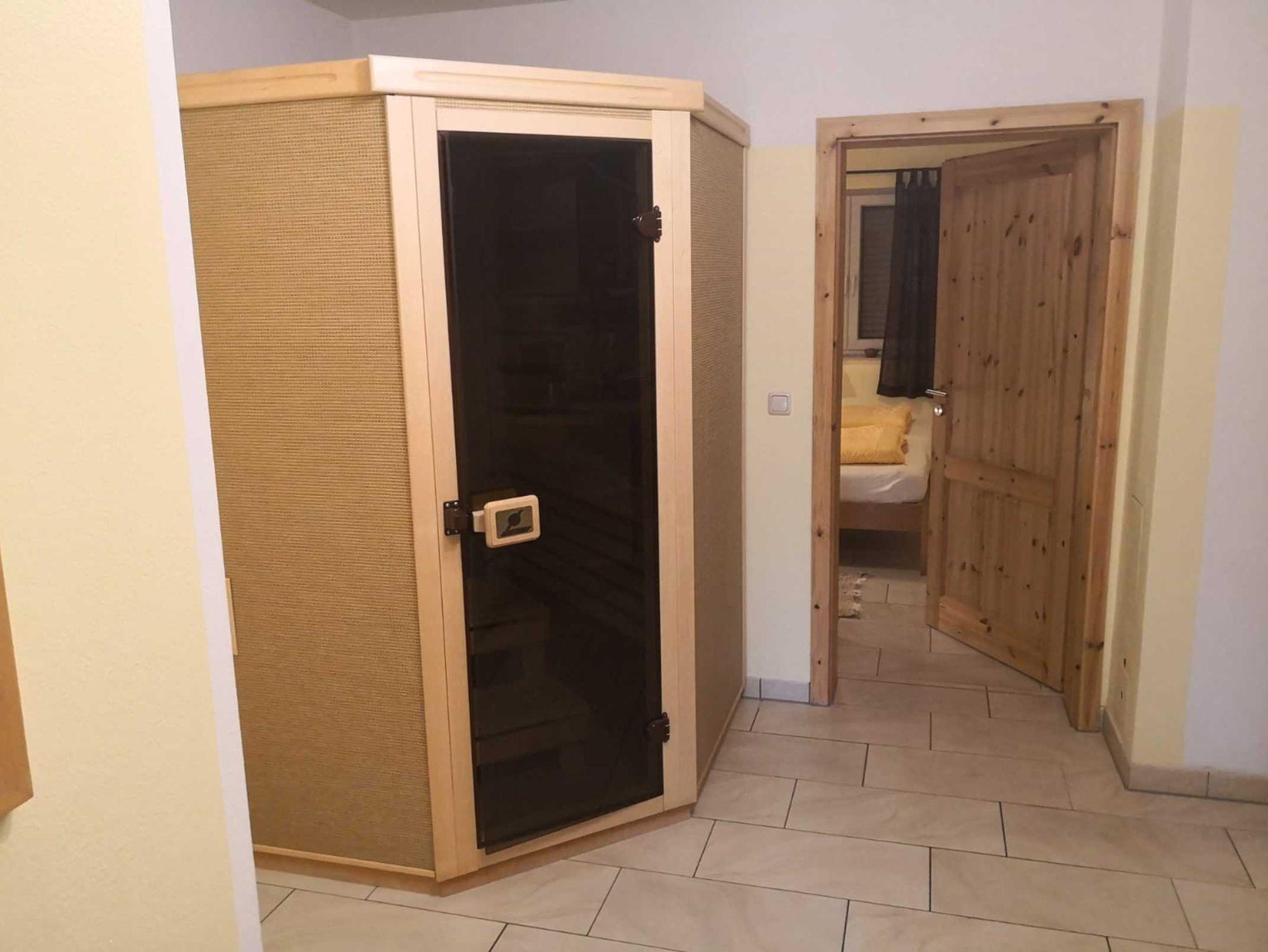 FeWo 1: Schlafzimmer mit Doppelbett und 2 Aufbettungsmöglichkeiten (Schlafsofa); Dusche mit WC; Infrarotsauna gegen Gebühr