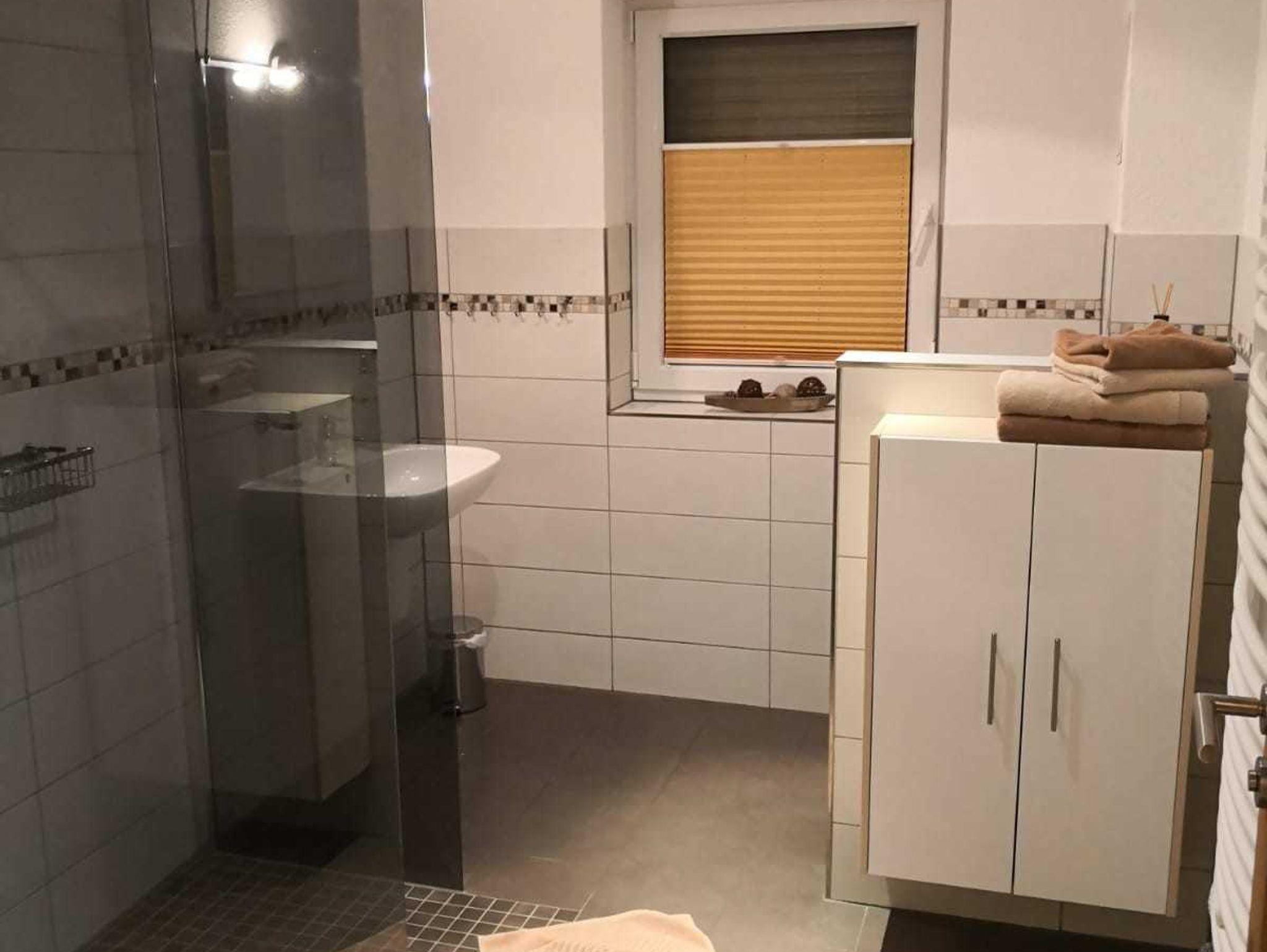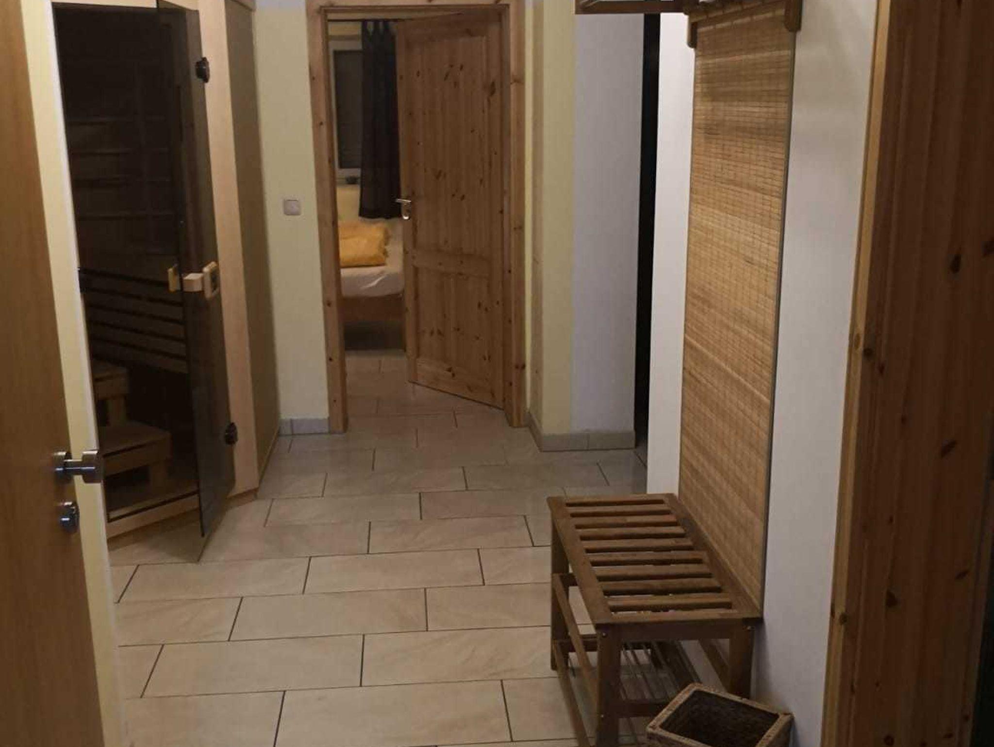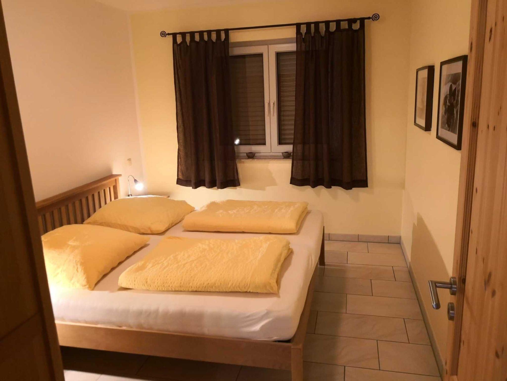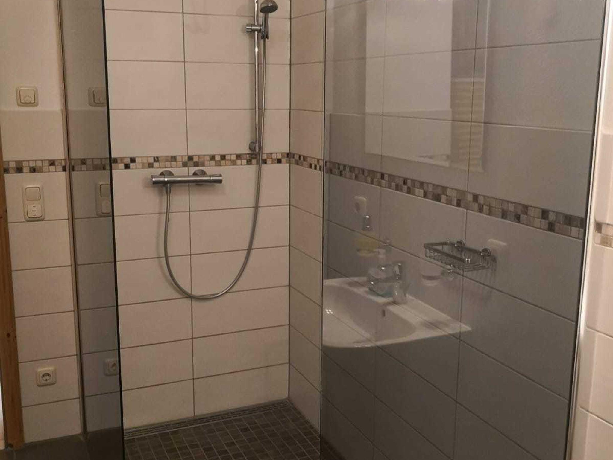 FeWo 1: Schlafzimmer mit Doppelbett und 2 Aufbettungsmöglichkeiten (Schlafsofa); Dusche mit WC; Infrarotsauna gegen Gebühr
