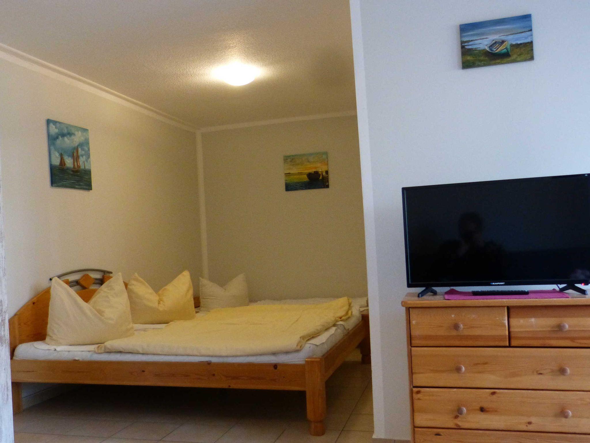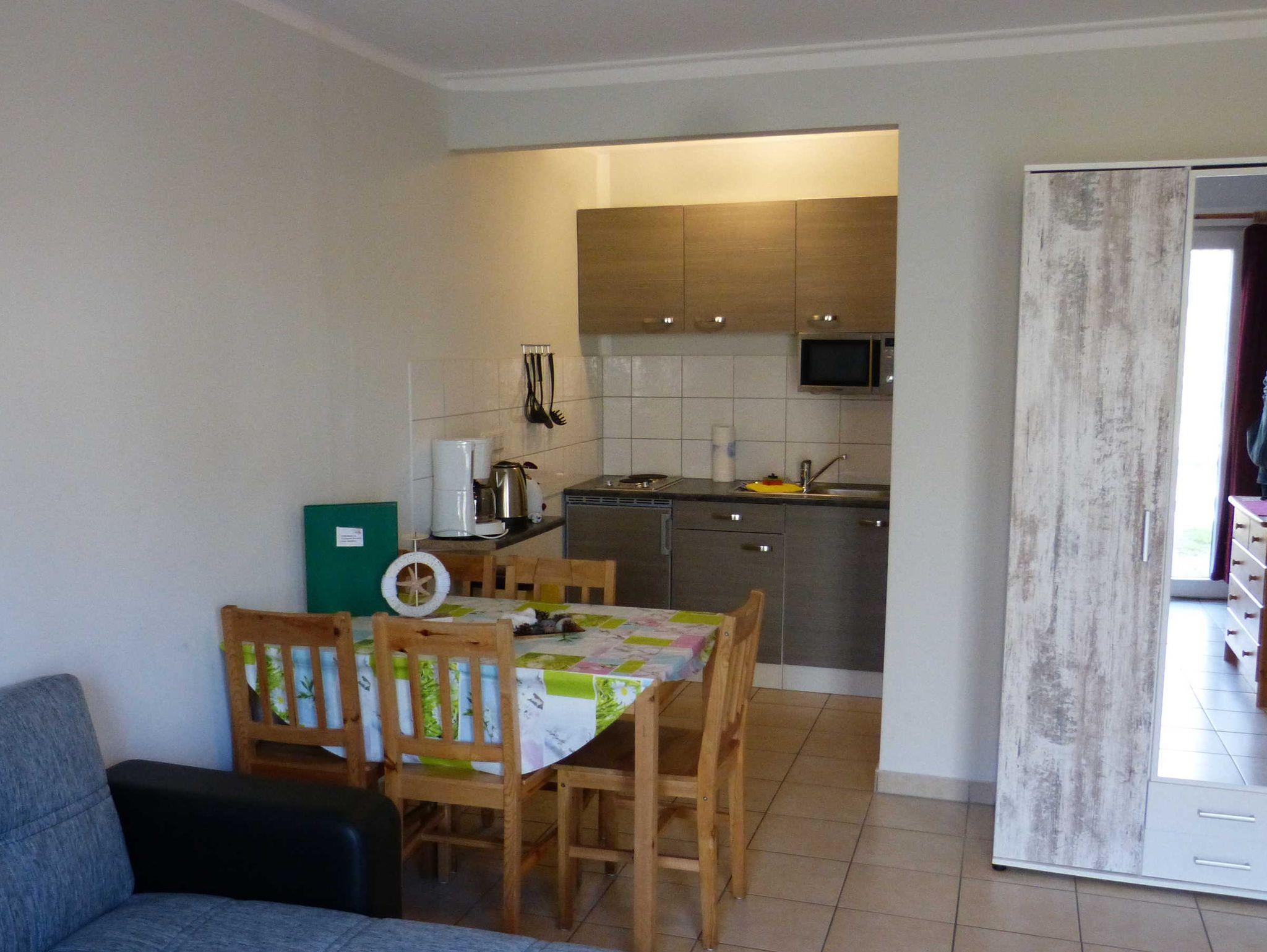 Die Ferienwohnung liegt im Erdgeschoß, hat eine Größe von 38 m² und verfügt über einen Wohnraum mit Pantry, ein Schlafzimmer mit einem Doppelbett, ein Badezimmer und eine Terrasse. In einer Nische im Wohnbereich befinden sich ein weiteres Doppel- und ein Einzelbett, zudem ist eine Aufbettung möglich (Schlafsofa). Die Miniküche ist ausgestattet mit zwei Kochplatten, einer Kaffemaschine, einem Wasserkocher, einem Toaster, einem Kühlschrank mit Gefrierfach sowie einer Mikrowelle. Wäsche kann zugebucht werden ((Handtuch- Bettwäschepaket 25,00 pro Person). Im Ferienpark kann ein Grill gemietet werden, ebenso ist die Nutzung einer gemeinschaftlichen Waschmaschine möglich (gegen Gebühr).