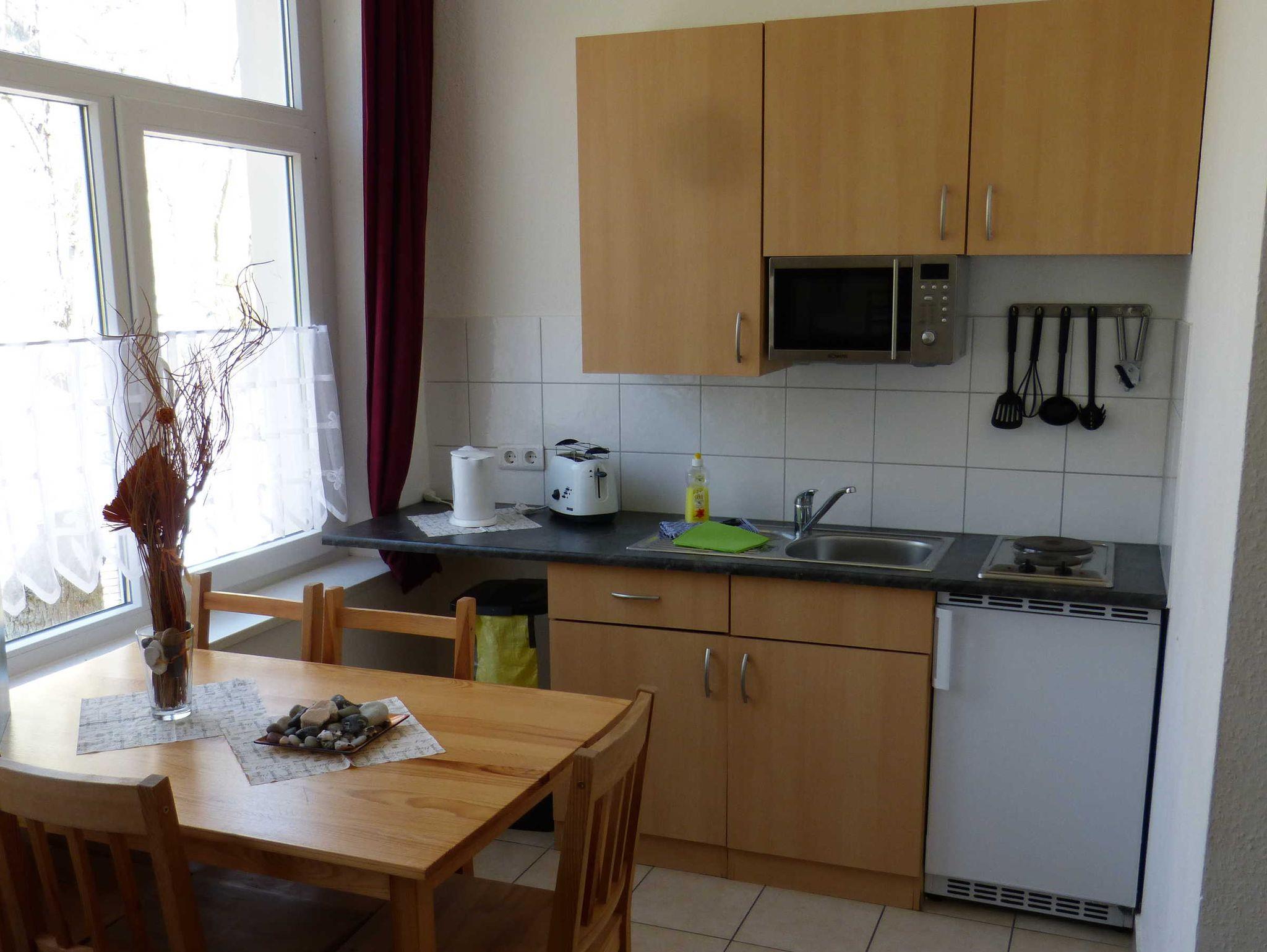 Die Ferienwohnung liegt im 1. Obergeschoß, hat eine Größe von 38 m² und verfügt über einen Wohnraum mit Pantry, ein Schlafzimmer mit einem Doppel- und einem 3-er Etagenbett und ein Badezimmer. Die Terrasse vor dem Haus kann gemeinschaftlich genutzt werden. In der Miniküche befinden sich zwei Kochplatten, eine Kaffemaschine, ein Wasserkocher, ein Toaster, ein Kühlschrank mit Gefrierfach sowie eine Mikrowelle. Wäsche kann zugebucht werden ((Handtuch- Bettwäschepaket 25,00 pro Person). Im Ferienpark kann ein Grill gemietet werden, ebenso ist die Nutzung einer gemeinschaftlichen Waschmaschine möglich (gegen Gebühr).