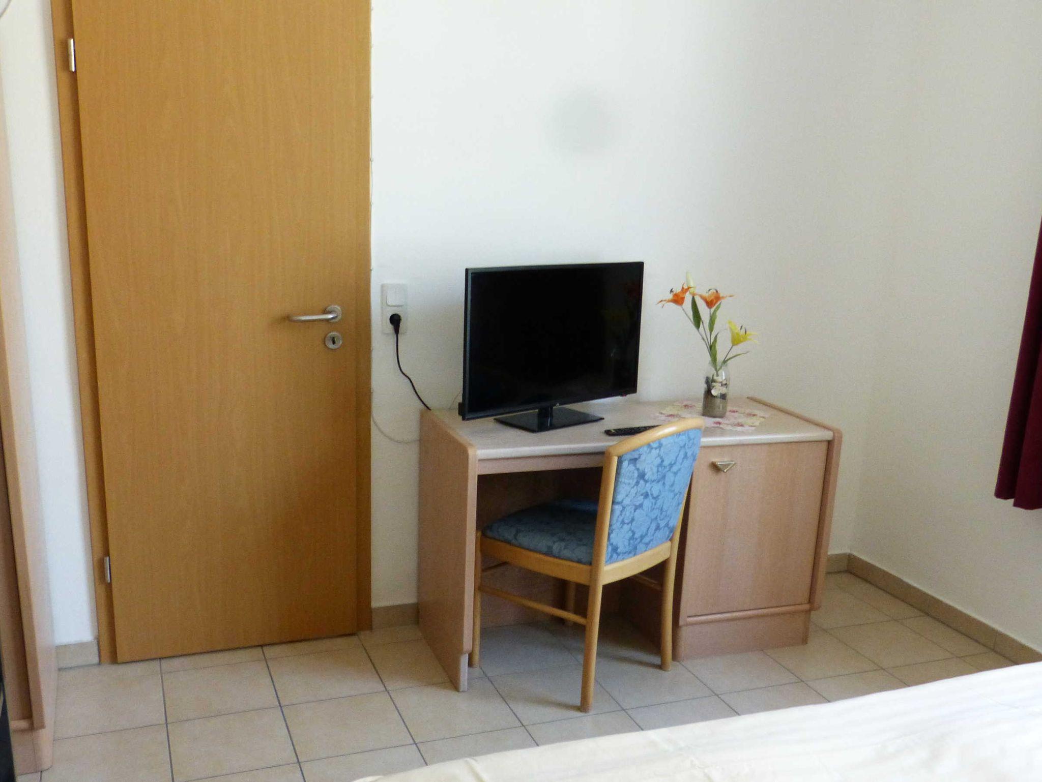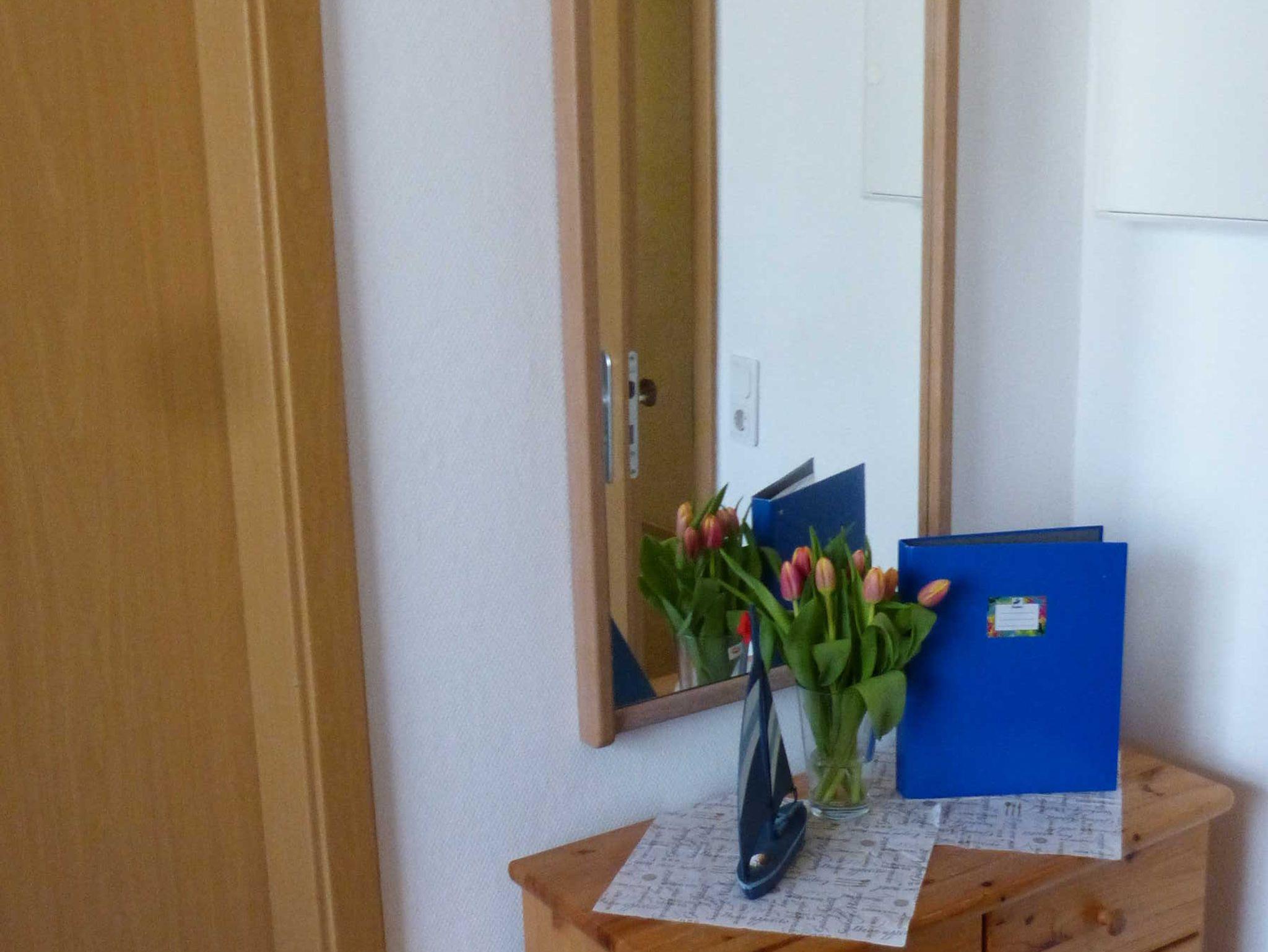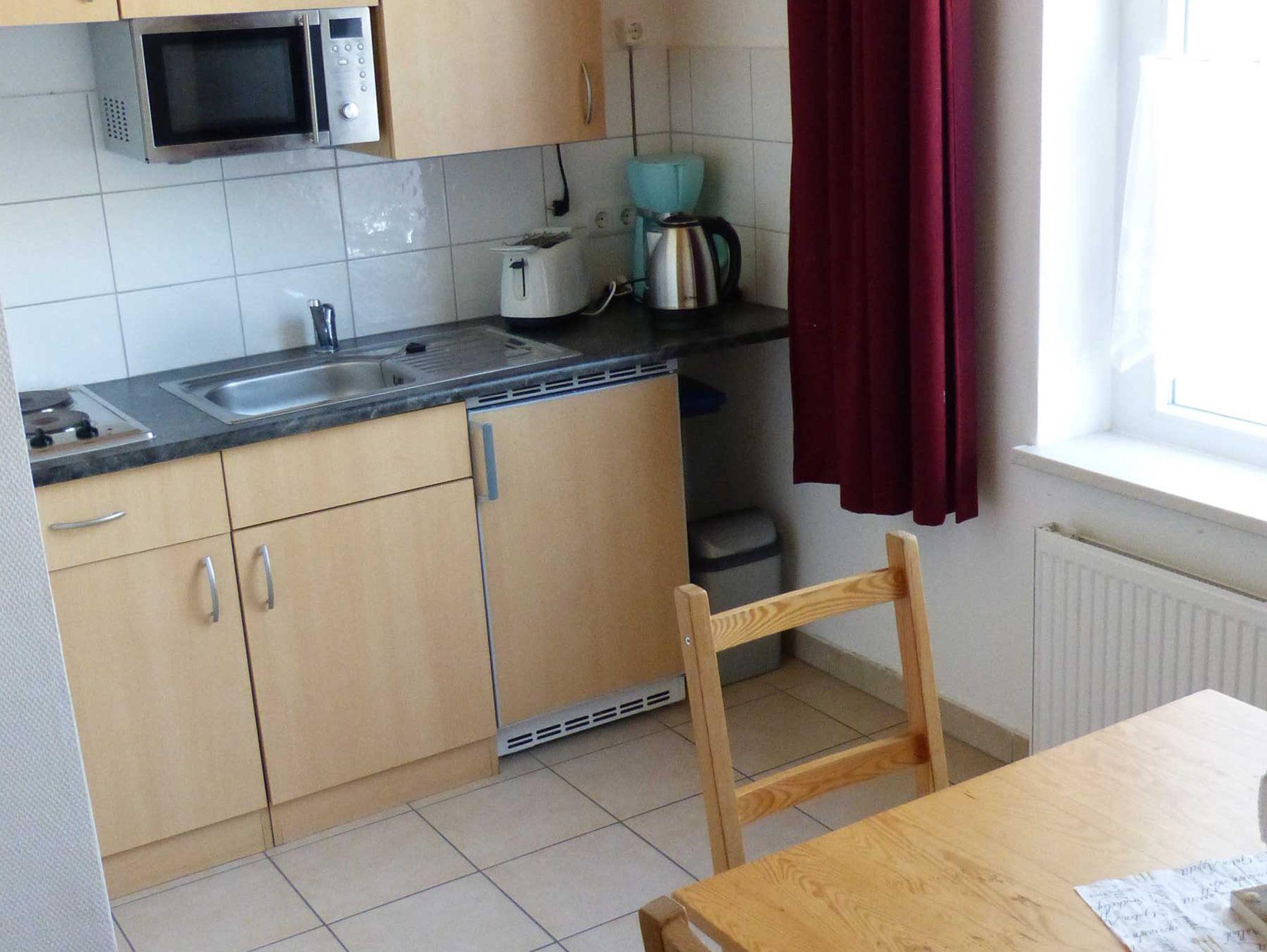 Die Ferienwohnung liegt im 1. Obergeschoß, hat eine Größe von 27 m² und verfügt über einen Wohnraum mit Pantry, ein Schlafzimmer mit einem Doppel- und einem 3-er Etagenbett und ein Badezimmer. Die Terrasse vor dem Haus kann gemeinschaftlich genutzt werden. In der Miniküche befinden sich zwei Kochplatten, eine Kaffemaschine, ein Wasserkocher, ein Toaster, ein Kühlschrank mit Gefrierfach sowie eine Mikrowelle. Wäsche kann zugebucht werden ((Handtuch- Bettwäschepaket 25,00 pro Person). Im Ferienpark kann ein Grill gemietet werden, ebenso ist die Nutzung einer gemeinschaftlichen Waschmaschine möglich (gegen Gebühr).