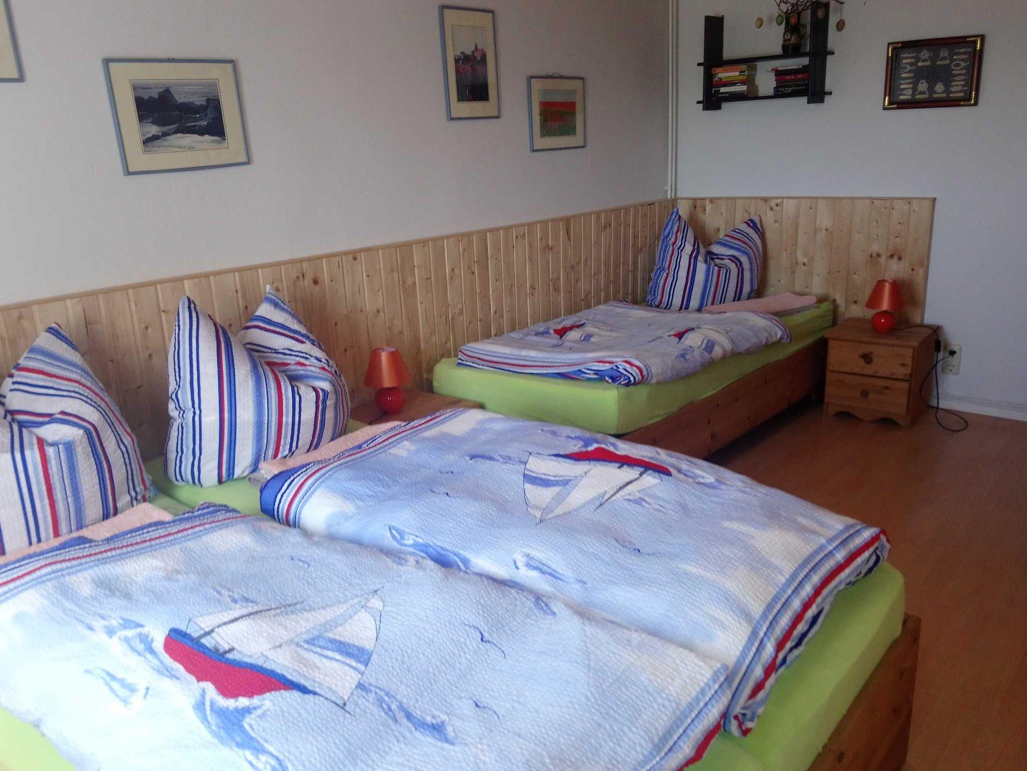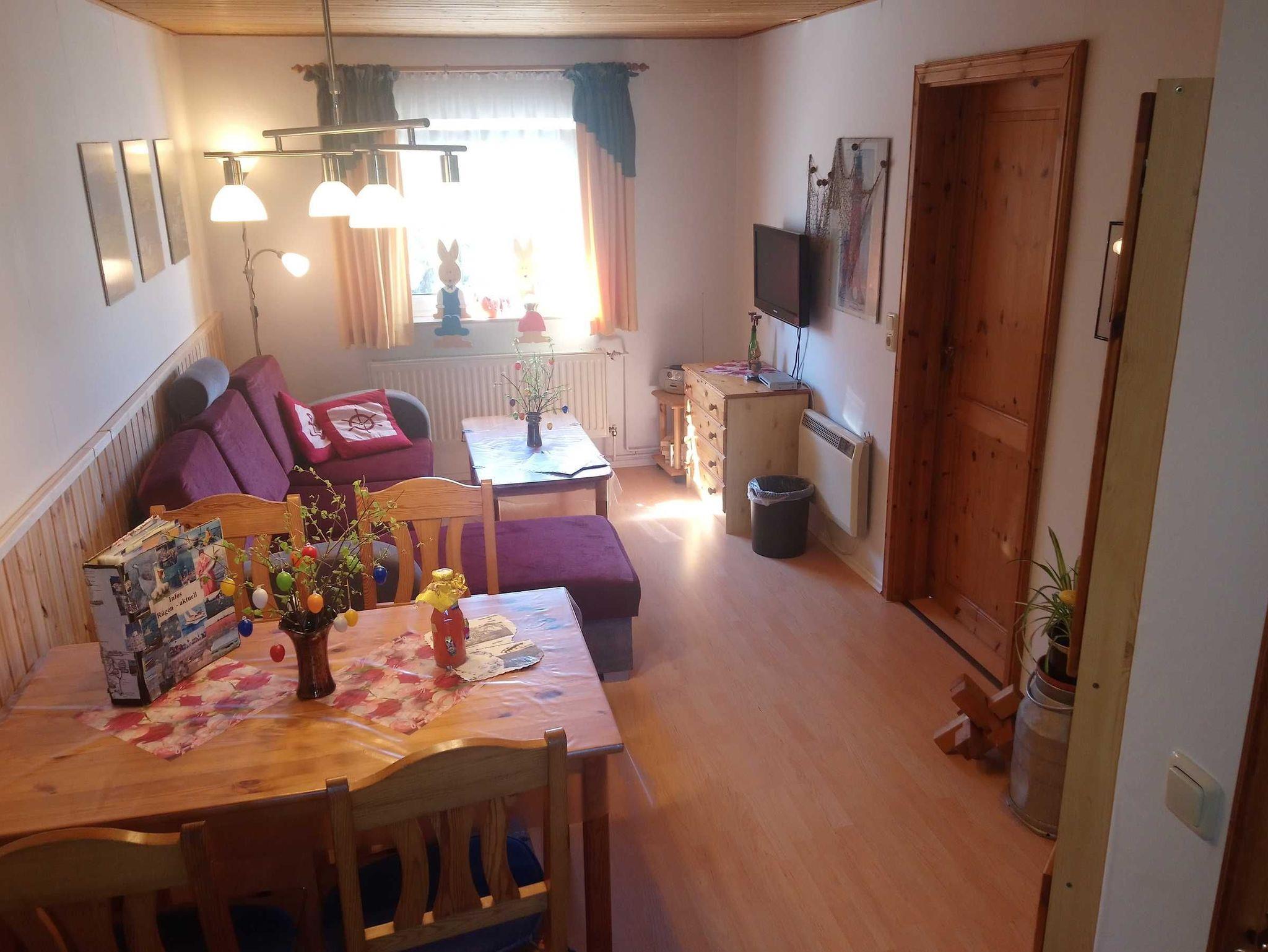 Die Ferienwohnung: ca. 45 qm, 2-3 Personen (+ 1 Aufbettung für Kinder bis 12 Jahre, befindet sich im Anbau des Vermieterhauses. Ausstattung: Wohnraum mit moderner Küchenzeile, TV, Radio, Ausziehcouch, Eßtisch, Schlafraum mit Doppelbett und Einzelbett, Dusche, WC.