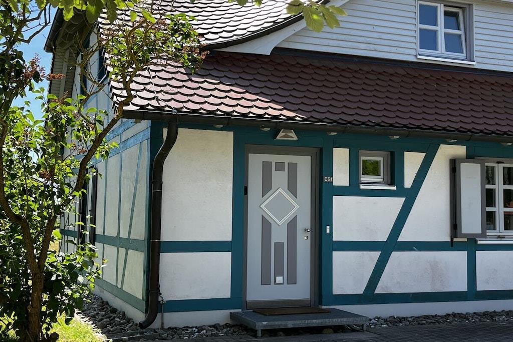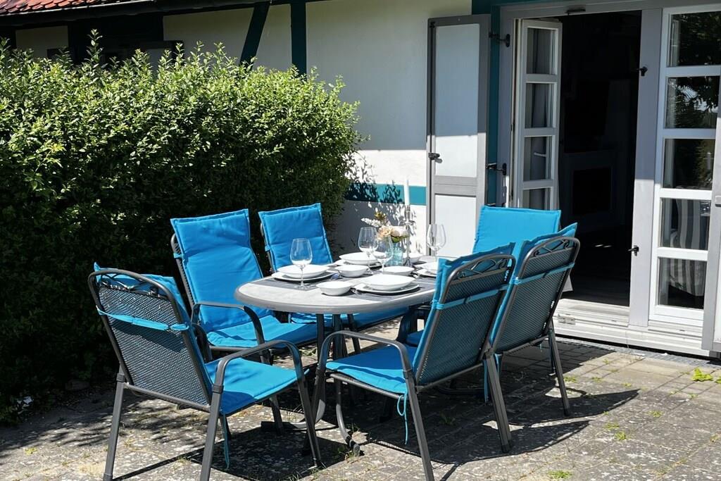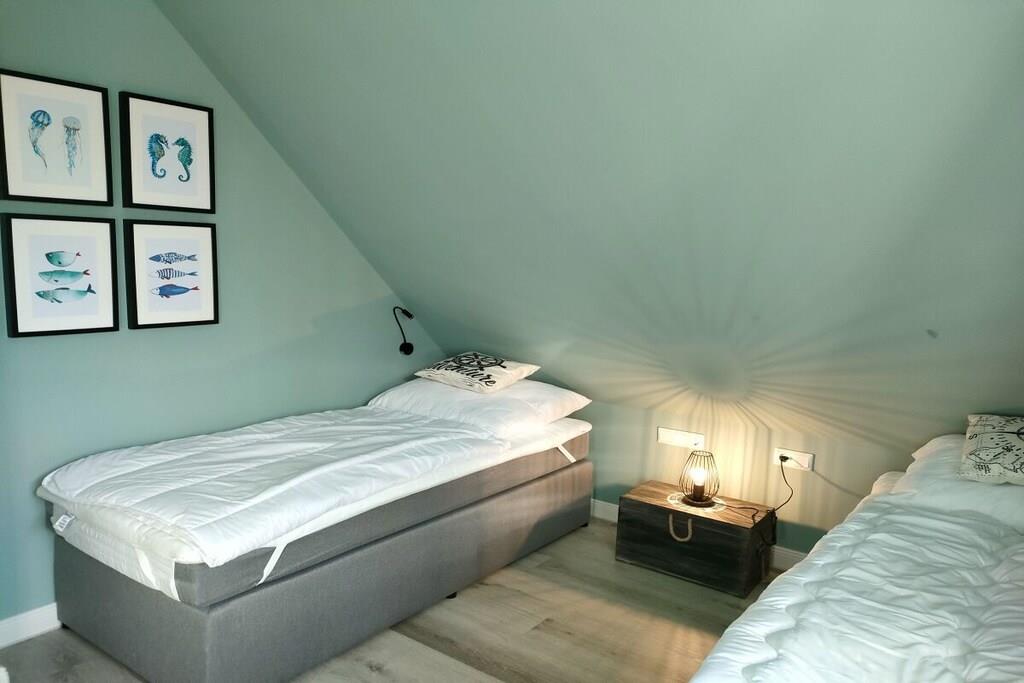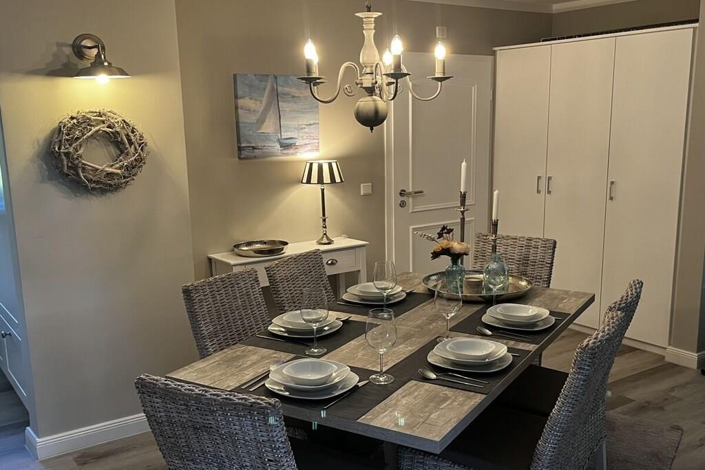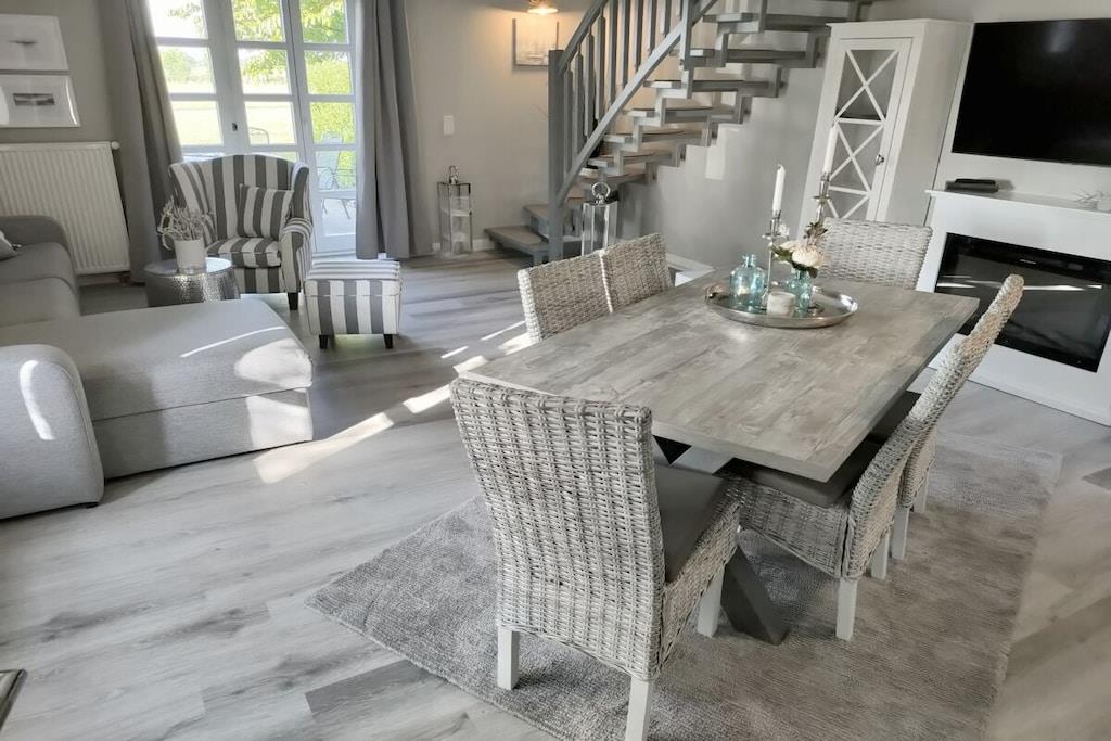 Vores nyrenoverede feriehus RUGIAMARE (Rügenhavet) ligger på grunden af ??feriebyen Bakenberg i landsbyen C 51, i Dranske Nord Rügen, omkring 400 meter fra klipperne og stranden. Den udlejes privat til feriegæster og tilbyder dig, dine børn og sidst, men ikke mindst din hund, et behageligt sted at bo og et skønt sted at løbe rundt. Legepladsen for børn, bageriet og den lille butik i feriekomplekset er naturligvis åbne for dig, ligesom restauranten "Alte Liebe". Huset byder på 75 kvadratmeter boligareal og 3 værelser fordelt på 2 etager. Huset er blevet renoveret og nyindrettet de sidste par måneder! RUGIAMARE har to soveværelser. Inklusiv højkvalitets sovesofa (med madras) nedenunder i stuen er der plads til op til 6 voksne eller børn. Til meget små børn er en foldbar babyseng også tilgængelig. Nedenunder er der et lille, men moderne, fuldt udstyret køkken med opvaskemaskine, køleskab, keramisk kogeplade, ovn-mikroovn kombination, kaffemaskine og vaskemaskine-tørretumbler. I samme plan ligger den hyggelige og stilfuldt indrettede opholds- og spiseafdeling samt et gæstetoilet ved siden af ??entréen. De to soveværelser med dobbeltsenge med boxspring eller to enkeltsenge er på øverste etage. De indbyggede skabe giver masser af opbevaringsplads til tøj, kufferter og andre ting. Du vil nyde den smukke udsigt over Bodden og landskabet gennem kviste! Badeværelset med badekar/bruser kombination er også placeret ovenpå. RUGIAMARE er udstyret med Wi-Fi, to moderne fladskærms-tv og et moderne lydsystem. Huset modtager varme og varmt vand fra fjernvarme i hele anlægget. Alt er der, der skal til for en ubekymret og afslappende ophold på RUGIAMARE på ethvert tidspunkt af året. Når du træder udenfor fra opholdsstuen (sydsiden), befinder du dig på en 14 kvm terrasse udstyret med havemøbler og grill. Udearealet omfatter desuden to parkeringspladser inden for synsvidde og to cykelstativer lige udenfor hoveddøren. Nyd de rummelige grønne omgivelser! RUGIAMARE er en del af en sammensætning af sommerhuse i bindingsværk/landhusstil, som er samlet omkring et lille landsbytorv. Dette bidrager til den idylliske stemning på stedet. Blot et par hundrede meter længere kan du opdage Kreptizer Heide over klipperne, eller lige så tæt på kan du tage trappen ned til den omfattende sandstrand, som indbyder til at blive hængende, svømme eller gå en tur på stranden, selv med din hund. Og sidst, men ikke mindst, har du et vidunderligt udgangspunkt for udflugter i det omkringliggende område og til andre attraktive destinationer på Rügen. VELKOMMEN til RUGIAMARE