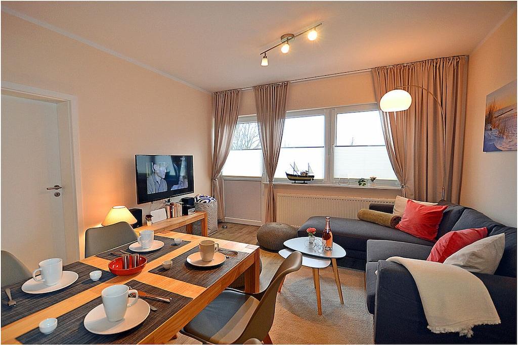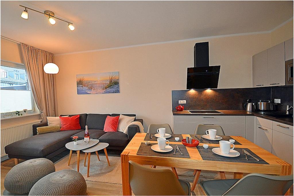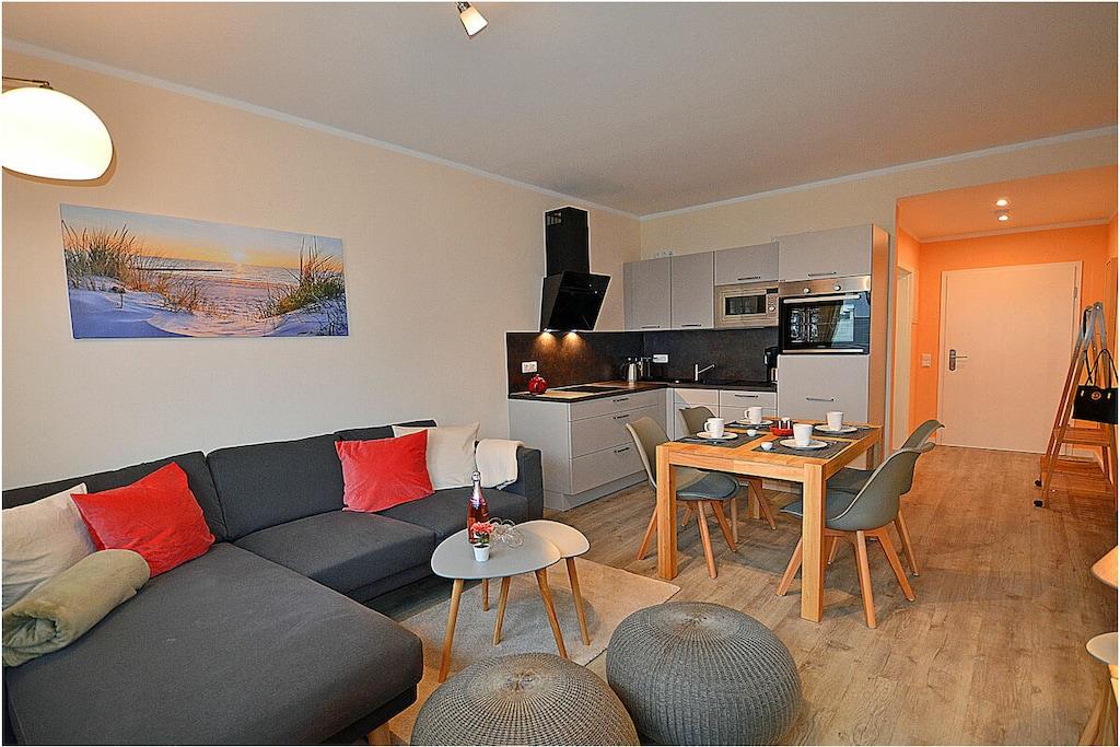 Parterre: moderner Wohn- Essbereich mit Terrassenzugang, gemütlicher Couch, TV/ Sat (Flatscreen), kostenfreies Internet (WLAN), Stereoanlage (Radio/CD), Gesellschaftsspiele für gemütliche Abende, offene komplett ausgestattete Einbauküche mit 4- Plattenherd (Ceranfeld), Backofen, Kühlschrank mit großem Gefrierfach, Geschirrspüler, Mikrowelle und diversen Elektrogeräten, 1. Schlafzimmer mit Doppelbett (durchgängige Matratze/ 180 x 200), und Kleiderschrank, 2. Schlafzimmer mit zwei Einzelbetten (je 90 x 200), als Kopfkissen und Bettdecken stehen Ihnen wahlweise die Maße 40×80 und 80×80 als Kopfkissen sowie 135×200 und 155×200 als Bettdecken zur Verfügung, Bad mit ebenerdiger Dusche, WC, Fön, Waschmaschine, schöne sonnige Terrasse mit Meerblick, bequemen Gartenmöbeln (für 4 Personen), Strandkorb und Sonnenschirm vorhanden, Grillmöglichkeit besteht (Grill vorhanden) “Herzlich willkommen in der schönen und neu renovierten Ferienwohnung „Sanddorn” Die Ferienwohnung ist komfortabel und modern eingerichtet. Der Badestrand ist nur 50 m entfernt und geht sehr flach ins Meer über und ist somit sehr gut für Kinder geeignet. Der feinsandige Ostseestrand ist 1 km entfernt. Die sonnige Terrasse mit Meerblick und Strandkorb lädt zum Verweilen und Entspannen ein. Die Ferienwohnung „Sanddorn“ ist eine Nichtraucherwohnung. Für die kleinen Gäste steht ein Kinderhochstuhl und ein Kinderreisebett zur Verfügung. Die Fenster sind mit Insektenschutz ausgestattet. Waschmaschine steht gebührenfrei zur Verfügung. Es gibt einen eigenen großen PKW-Stellplatz direkt am Objekt. Bei uns sind Hunde willkommen (Gebühr Euro 7,50/ pro Hund/ pro Nacht). Einkaufsmöglichkeiten, Bäcker, Restaurants befinden sich in unmittelbarer Nähe. Es gibt optimale Rad- und Wandermöglichkeiten um die Insel zu erkunden. Nur 80 m entfernt ist ein Anlegesteg für Schifffahrten nach Hiddensee und ca. 250 m entfernt gibt es die Wassersportschule „Rügen-Piraten“, bei der man auch Equipment für Kayak, SUP, Segeln, Kiten und Windsurfen ausleihen kann. Reitmöglichkeiten in 5 km Entfernung beim „Pferdezentrum Balance“ und in 10 km Entfernung der „Reiterhof-Schwarbe“ mit Boddenritt und Ponyführen für die Kleinen, runden das Angebot ab.